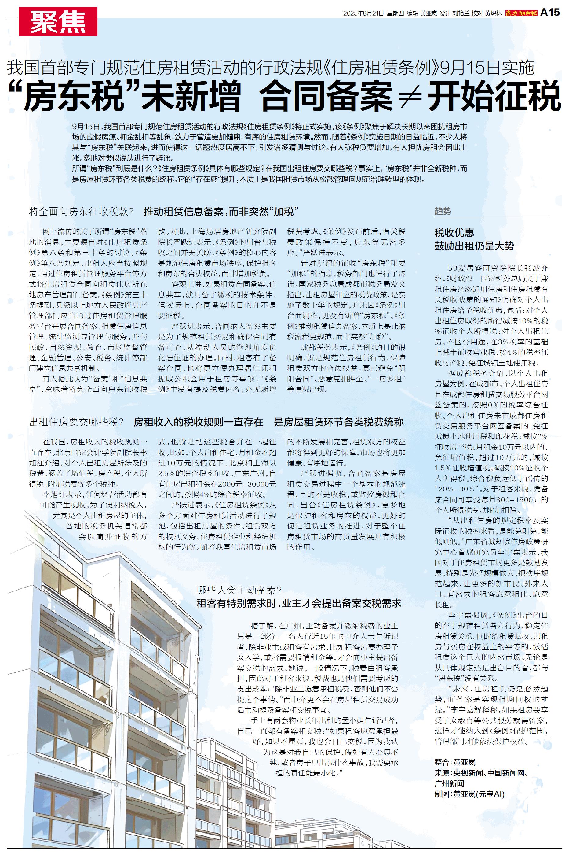 9月15日,我国首部专门规范住房租赁活动的行政法规《住房租赁条例》将正式实施,该《条例》聚焦于解决长期以来困扰租房市场的虚假房源、押金乱扣等乱象,致力于营造更加健康、有序的住房租赁环境。然而,随着《条例》实施日期的日益临近,不少人将其与“房东税”关联起来,进而使得这一话题热度居高不下,引发诸多猜测与讨论。有人称税负要增加,有人担忧房租会因此上涨。多地对类似说法进行了辟谣。