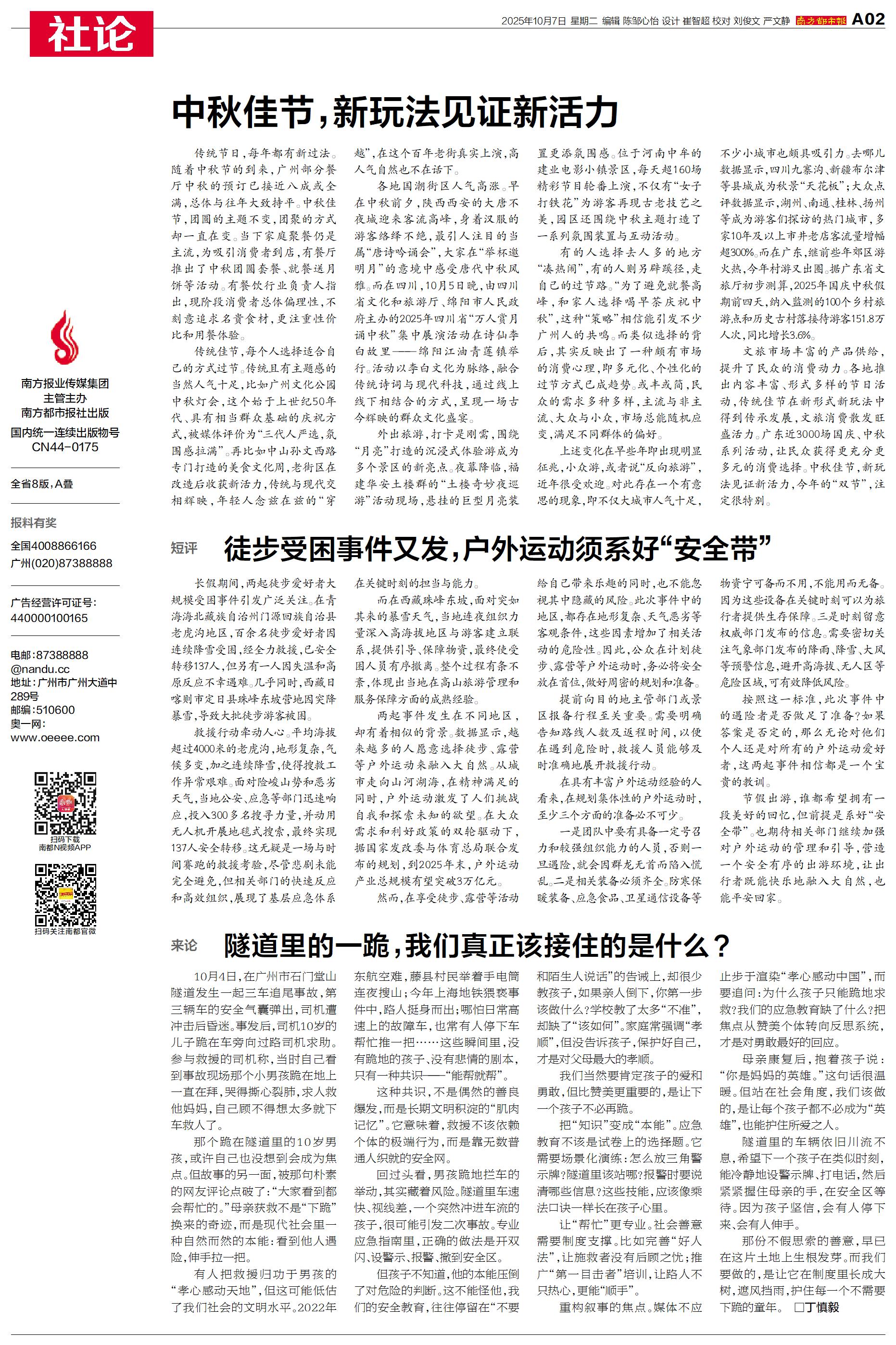节假出游,谁都希望拥有一段美好的回忆,但前提是系好“安全带”。也期待相关部门继续加强对户外运动的管理和引导,营造一个安全有序的出游环境,让出行者既能快乐地融入大自然,也能平安回家。