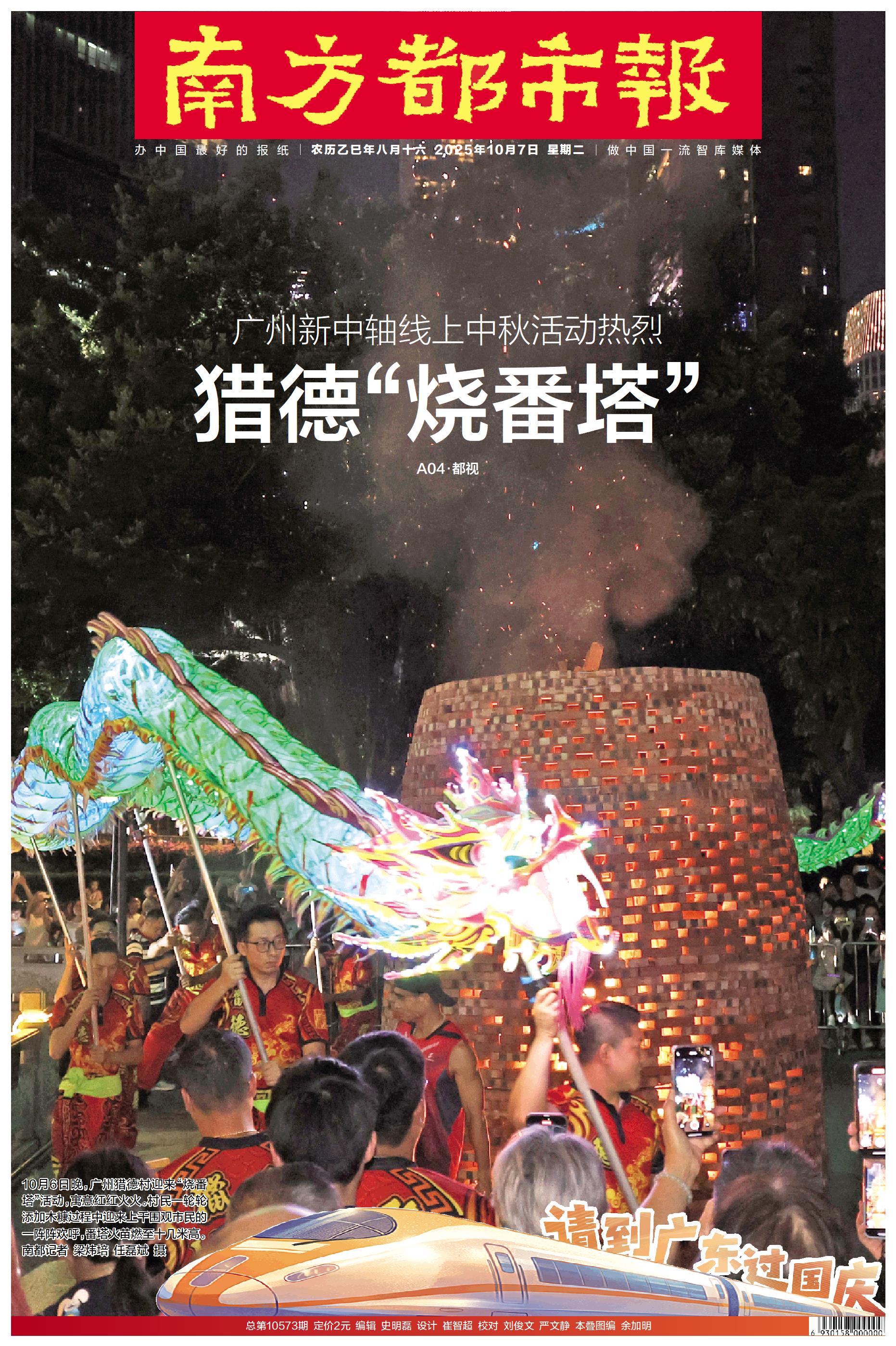 10月6日晚,广州猎德村迎来“烧番塔”活动,寓意红红火火。村民一轮轮添加木糠过程中迎来上千围观市民的一阵阵欢呼,番塔火苗燃至十几米高。 南都记者 梁炜培 任磊斌 摄