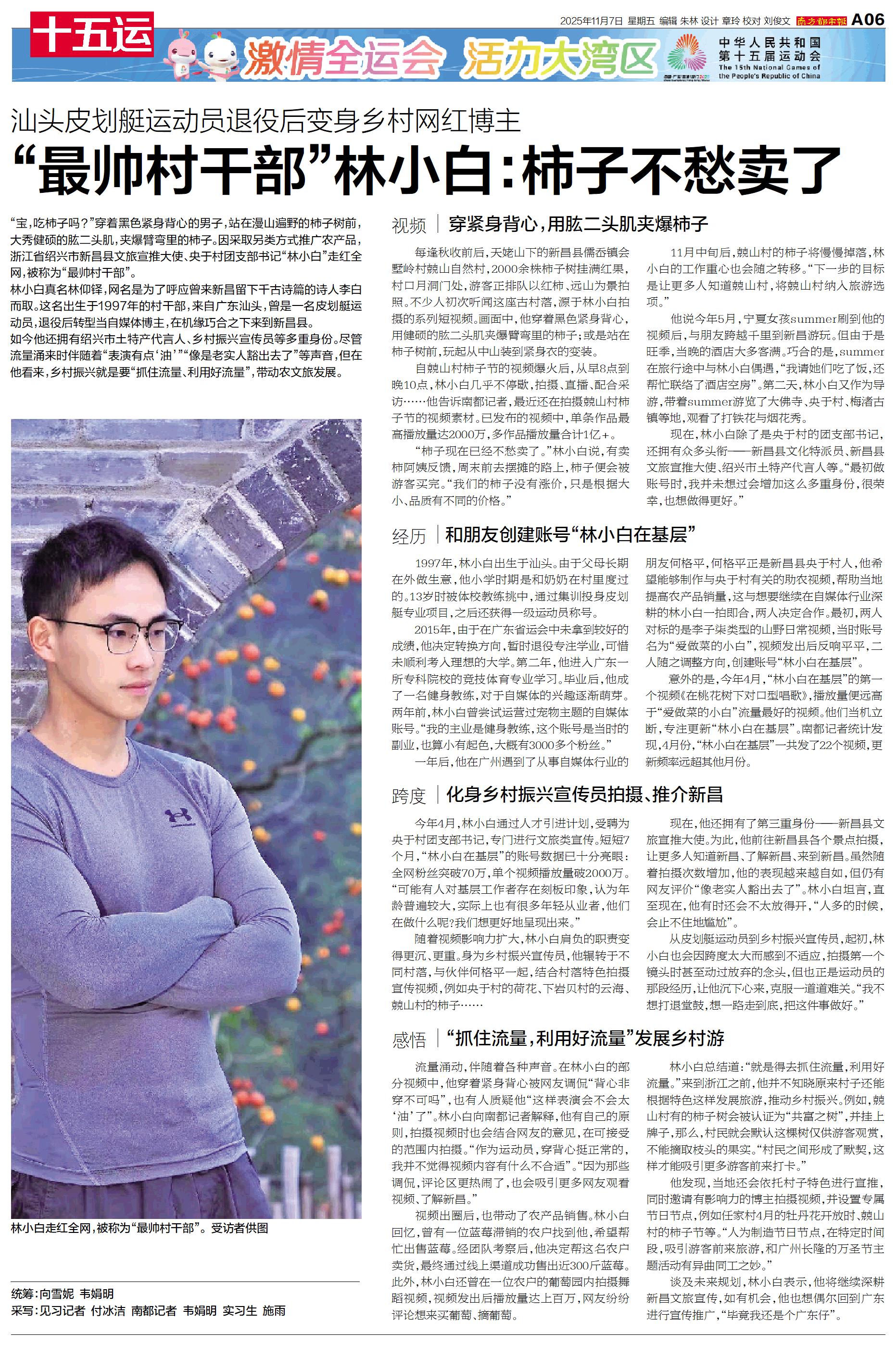 从皮划艇运动员到乡村振兴宣传员,起初,林小白也会因跨度太大而感到不适应,拍摄第一个镜头时甚至动过放弃的念头,但也正是运动员的那段经历,让他沉下心来,克服一道道难关。“我不想打退堂鼓,想一路走到底,把这件事做好。”