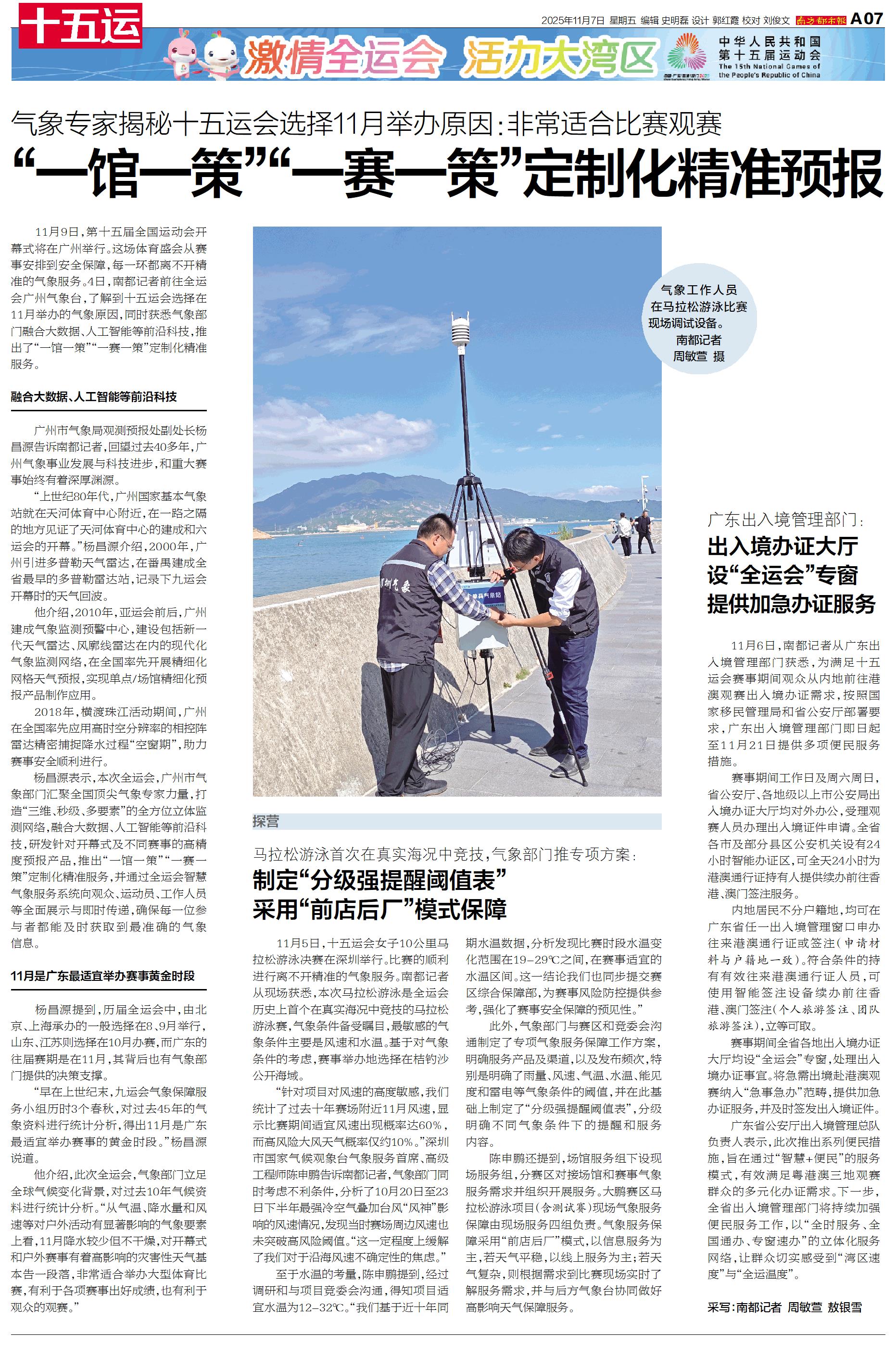 杨昌源表示,本次全运会,广州市气象部门汇聚全国顶尖气象专家力量,打造“三维、秒级、多要素”的全方位立体监测网络,融合大数据、人工智能等前沿科技,研发针对开幕式及不同赛事的高精度预报产品,推出“一馆一策”“一赛一策”定制化精准服务,并通过全运会智慧气象服务系统向观众、运动员、工作人员等全面展示与即时传递,确保每一位参与者都能及时获取到最准确的气象信息。