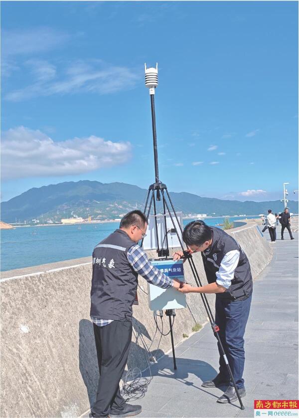 气象工作人员在马拉松游泳比赛现场调试设备。南都记者周敏萱 摄