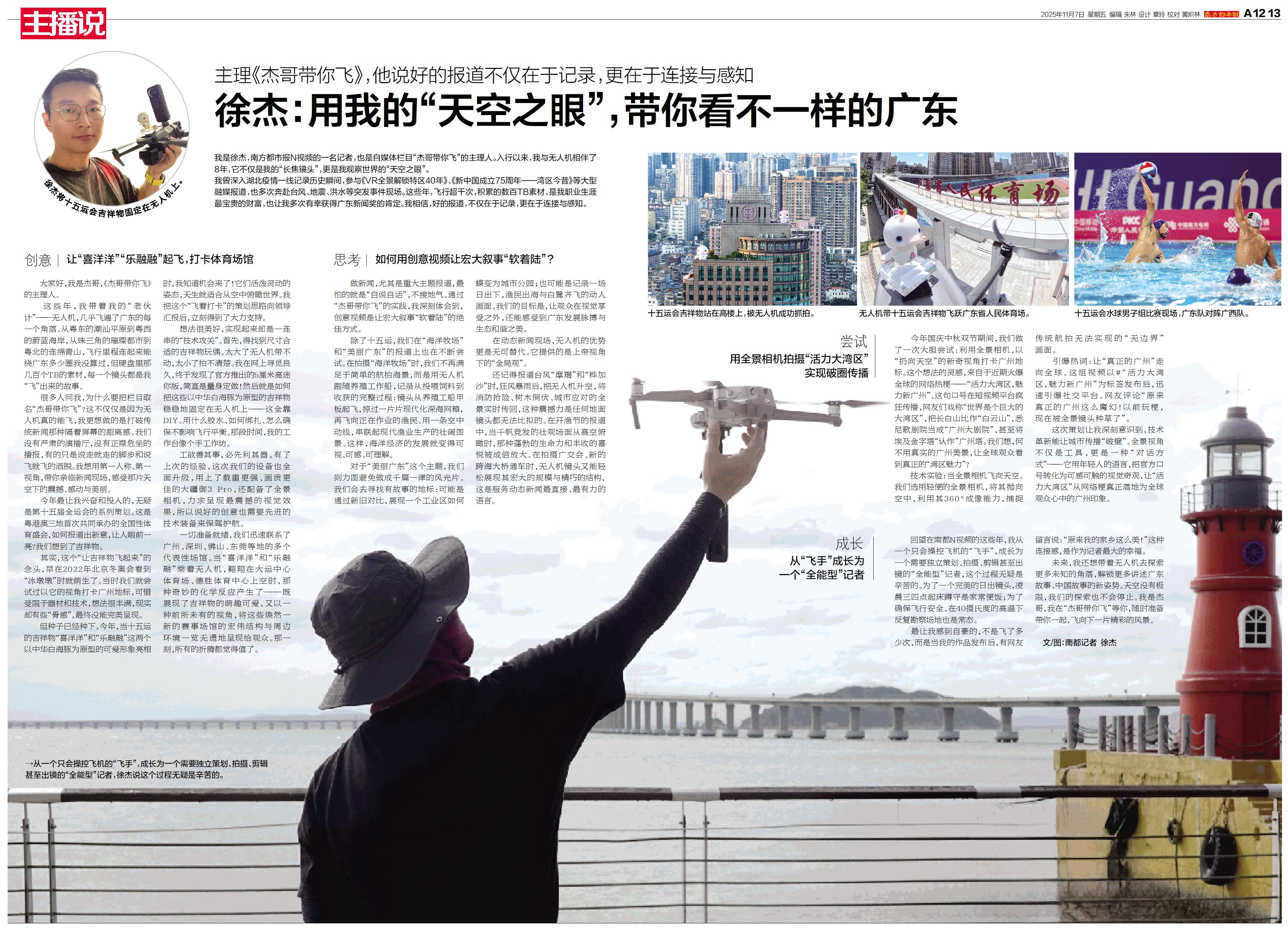 我是徐杰,南方都市报N视频的一名记者,也是自媒体栏目“杰哥带你飞”的主理人。入行以来,我与无人机相伴了8年,它不仅是我的“长焦镜头”,更是我观察世界的“天空之眼”。