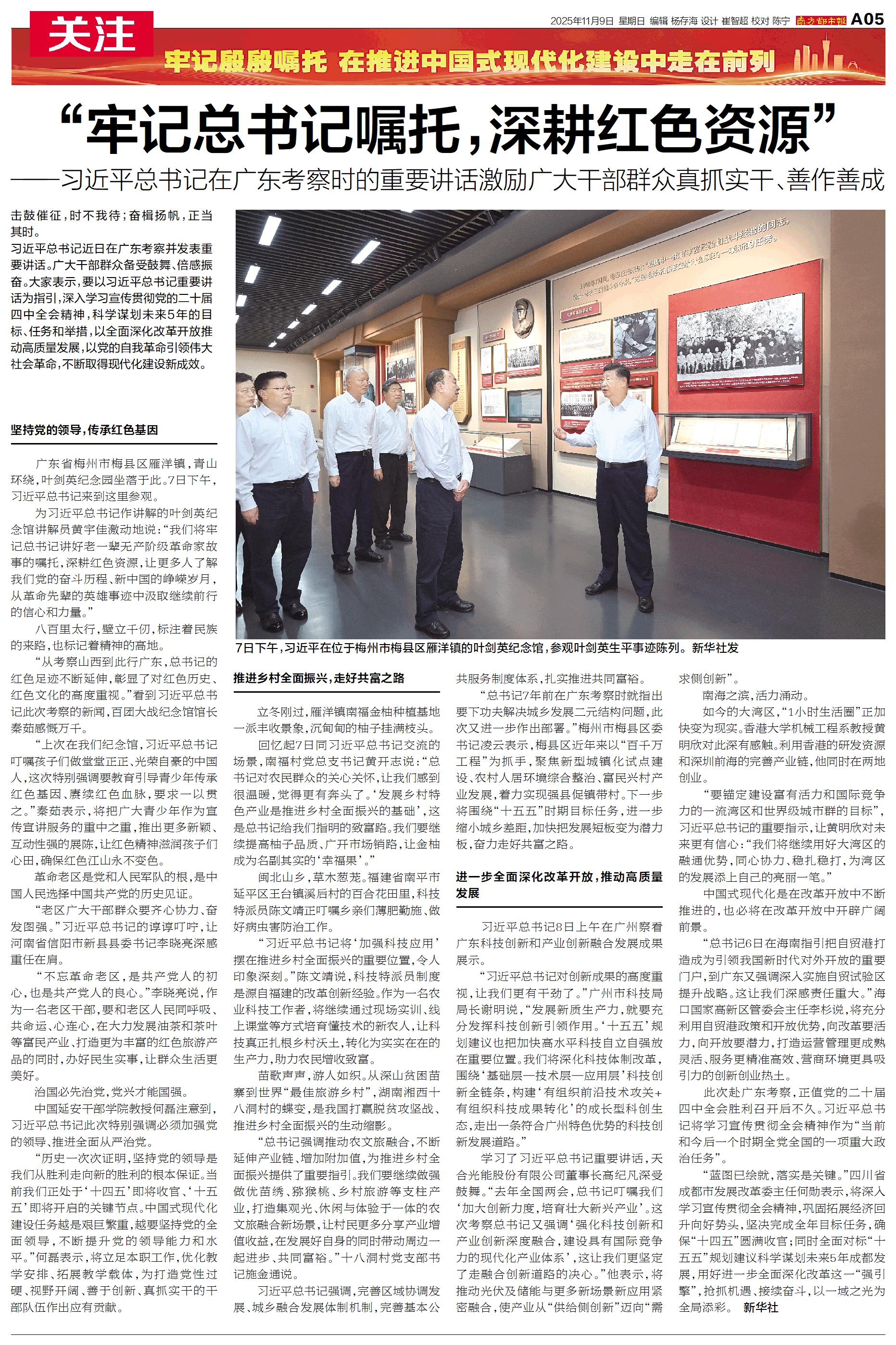 为习近平总书记作讲解的叶剑英纪念馆讲解员黄宇佳激动地说:“我们将牢记总书记讲好老一辈无产阶级革命家故事的嘱托,深耕红色资源,让更多人了解我们党的奋斗历程、新中国的峥嵘岁月,从革命先辈的英雄事迹中汲取继续前行的信心和力量。”