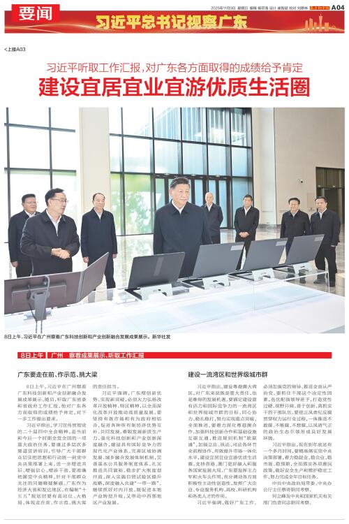 8日上午,习近平在广州察看广东科技创新和产业创新融合发展成果展示。随后,听取广东省委和省政府工作汇报。他对广东各方面取得的成绩给予肯定,对下一步工作提出要求。