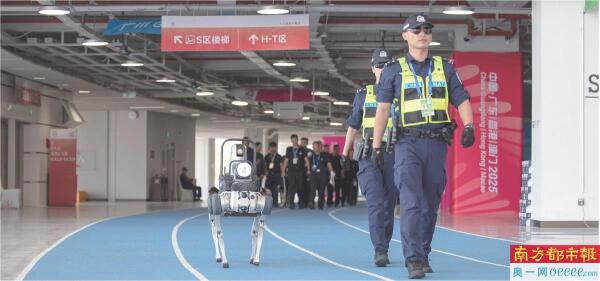 南都记者注意到,广东警方还派出了机器人和机械狗投入安保工作。带有高清摄像头和传感器的巡逻机器人,可实现大数据智能识别,跟人语音互动,做好安全提醒。巡逻机械狗是四足仿生设计,能灵活钻通道、上台阶,传统巡逻到不了的角落它都能去,观察发现的视角更加全面。广州交警使用的AI眼镜,只需1-2秒即可识别车辆是否持证,这款眼镜集显示屏、音频传感器、相机、算法芯片于一体,可以第一时间识别车辆号牌并进行比对,能够快速准确筛查出可通行车辆,有效避免车辆在入口处扎堆。