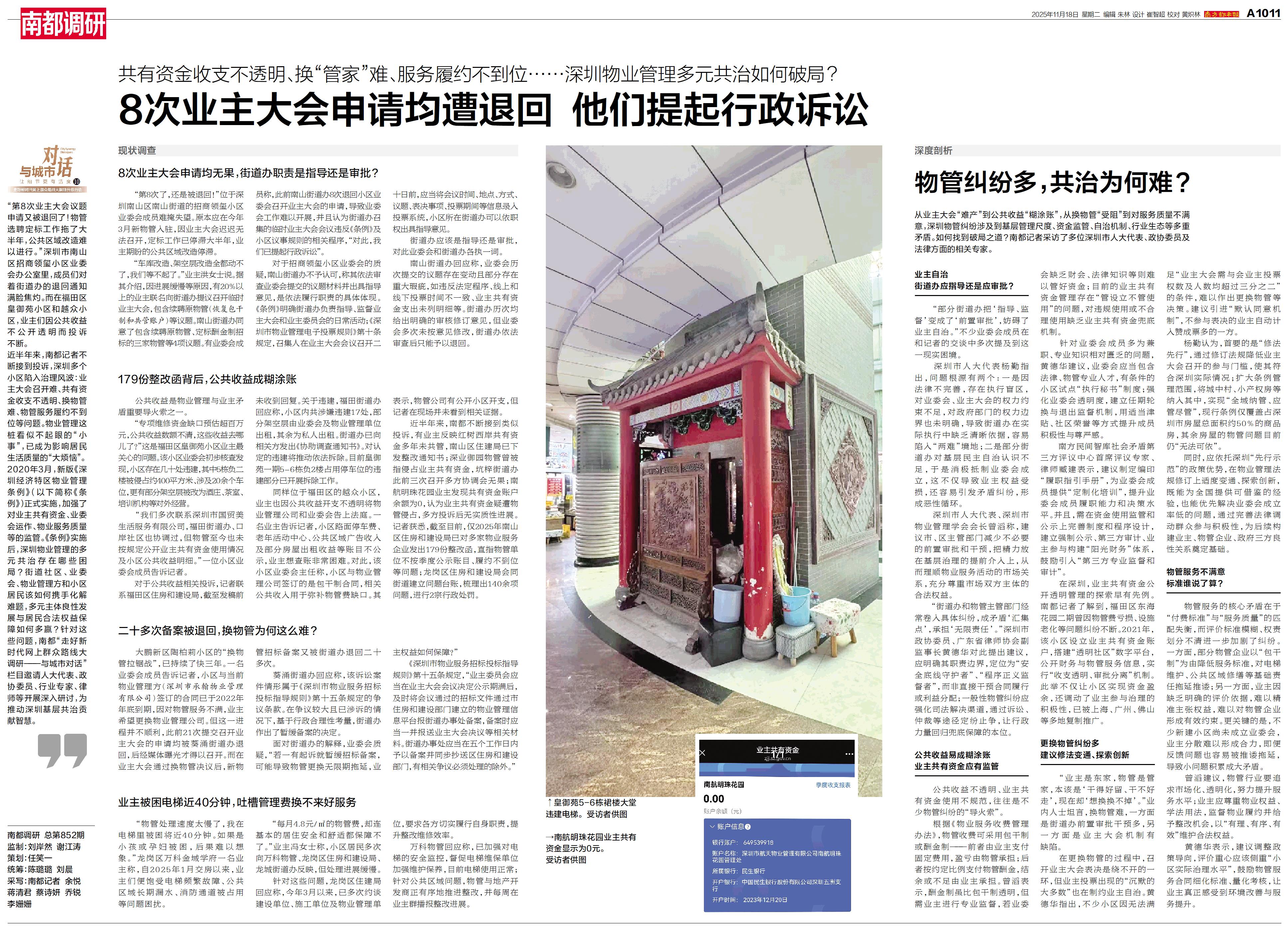 近半年来,南都记者不断接到投诉,深圳多个小区陷入治理风波:业主大会召开难、共有资金收支不透明、换物管难、物管服务履约不到位等问题。