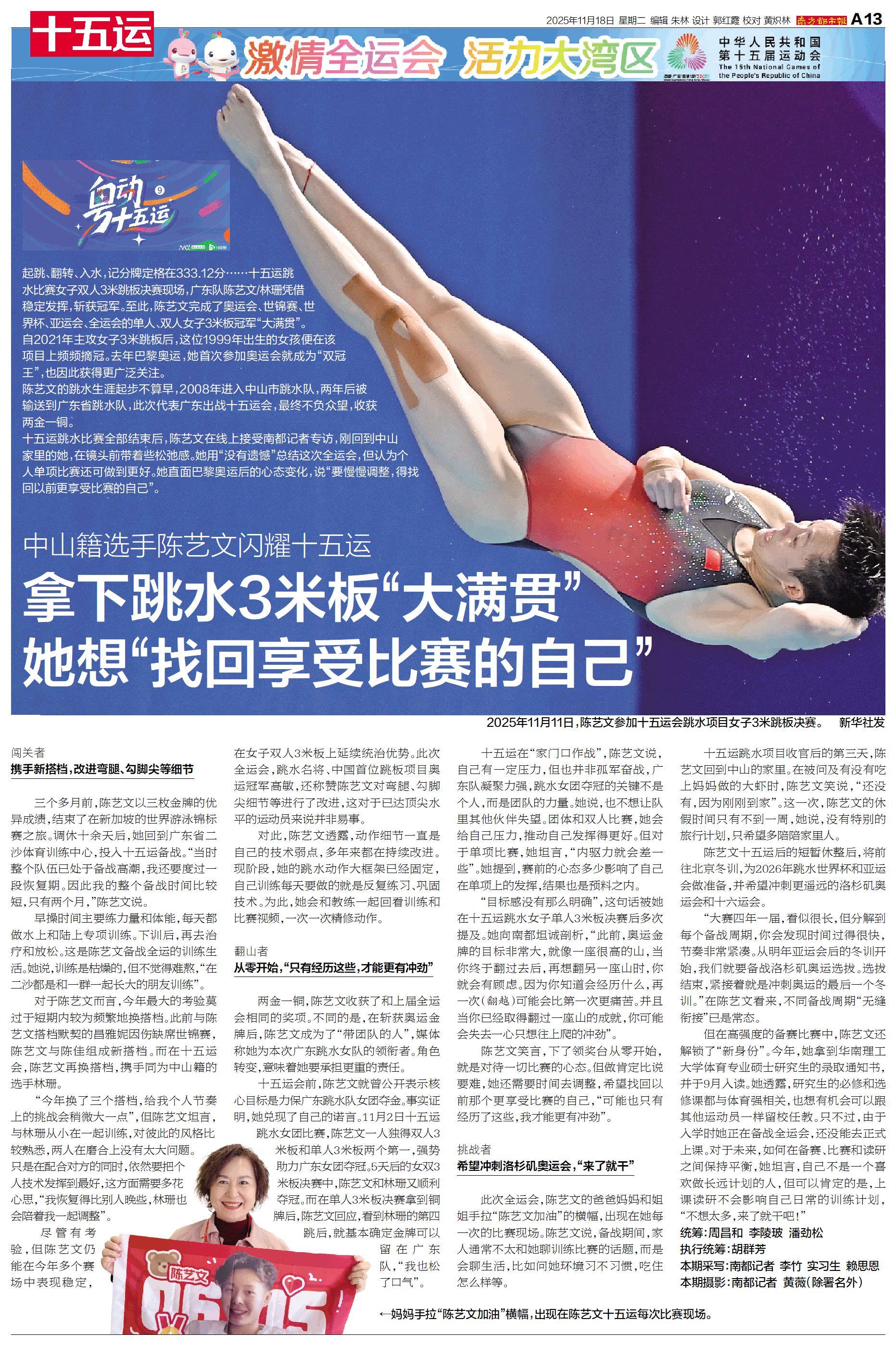 起跳、翻转、入水,记分牌定格在333.12分……十五运跳水比赛女子双人3米跳板决赛现场,广东队陈艺文/林珊凭借稳定发挥,斩获冠军。