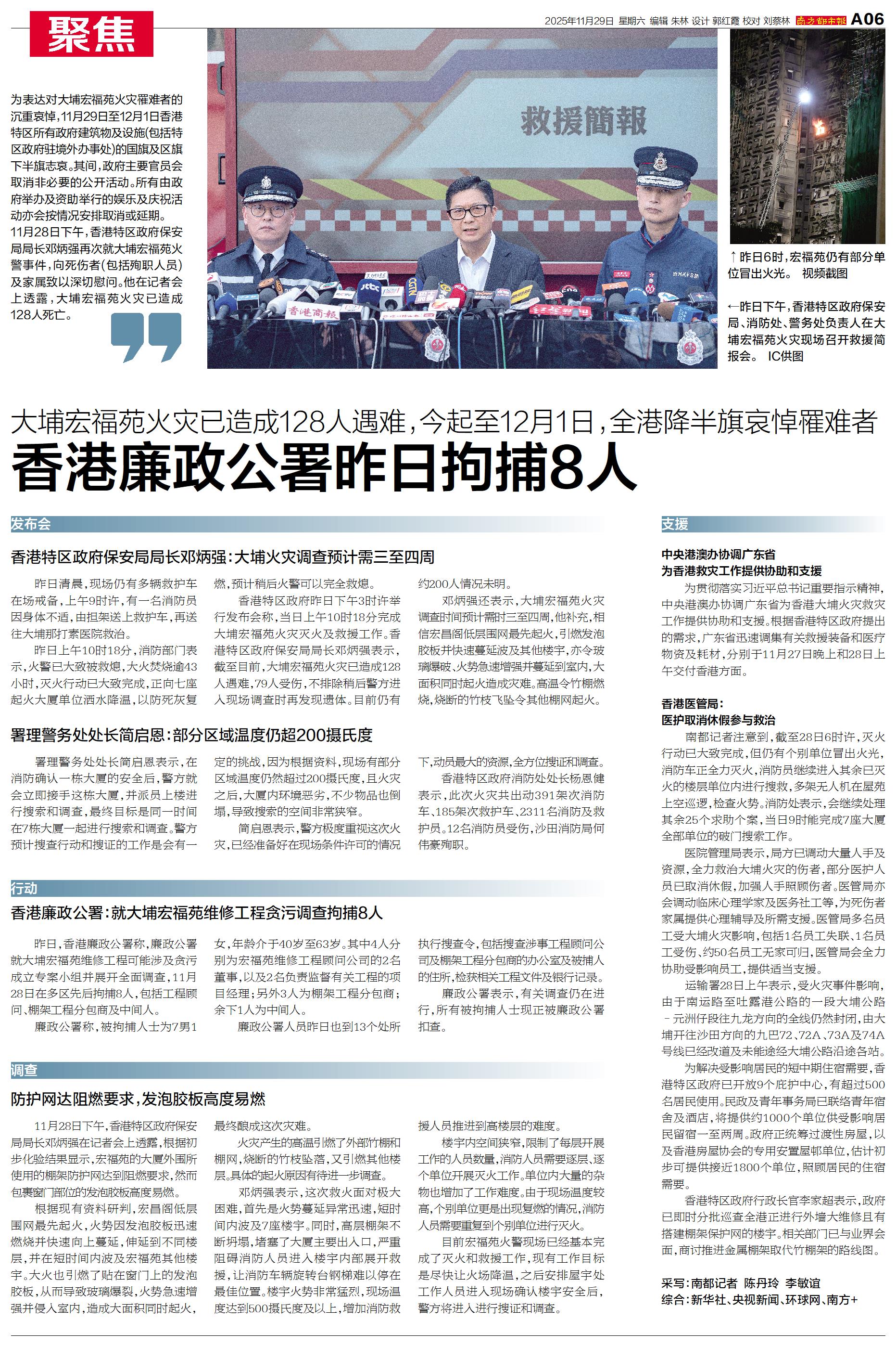 为表达对大埔宏福苑火灾罹难者的沉重哀悼,11月29日至12月1日香港特区所有政府建筑物及设施(包括特区政府驻境外办事处)的国旗及区旗下半旗志哀。