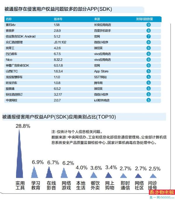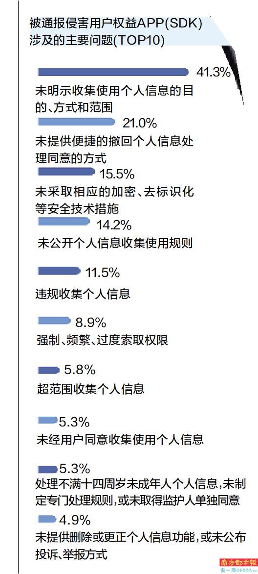 今年以来,中央网信办、工业和信息化部、公安部等部门已累计通报千余款存在侵害用户权益行为的APP(SDK),依法依规查处各类违法违规行为。南都大数据研究院梳理今年1-10月通报数据发现,这些被通报的APP(SDK)有14.1%来自应用宝;从违规类型来看,“未明示收集使用个人信息的目的、方式和范围”最为突出,占比达41.3%。“T3出行”APP、“轻喜到家”APP、“7 ELEVEN会员”微信小程序、“下厨房”百度小程序等多款知名应用曾被点名,更有“雷石KTV”(1.58版本)被检测出涉及9项违规,成为今年被通报问题最多的应用。