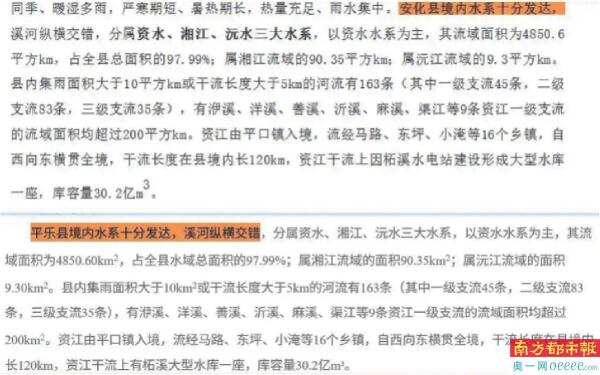 有网友发现,广西桂林市平乐县政府官网公布的《平乐县森林防火规划(2023—2030年)》中,关于当地水文基本情况的表述,与几年前一篇介绍湖南省益阳市安化县的文章措辞高度雷同,仅仅是个别计量单位的写法和修饰语稍有不同。