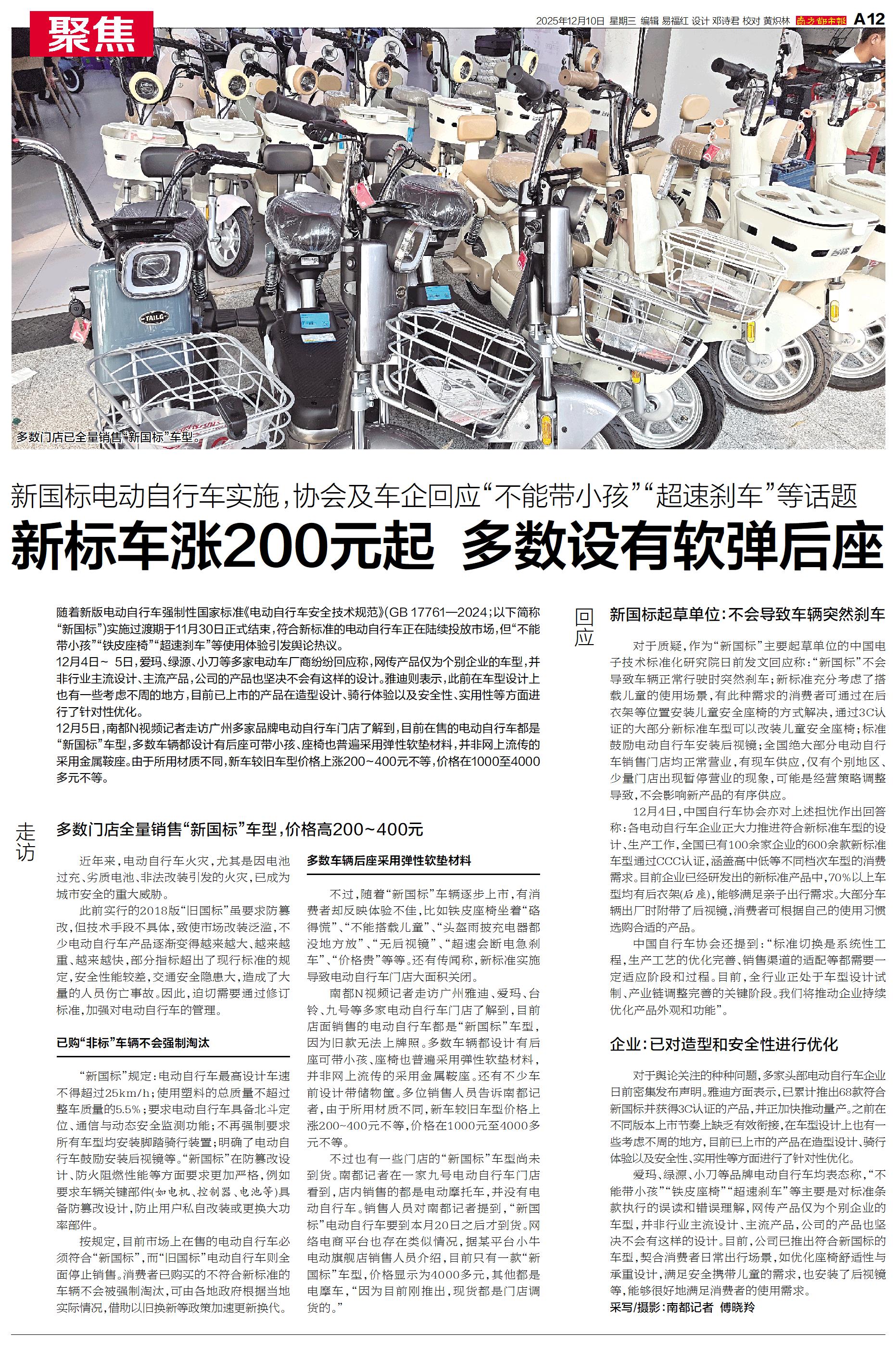 12月5日,南都N视频记者走访广州多家品牌电动自行车门店了解到,目前在售的电动自行车都是“新国标”车型,多数车辆都设计有后座可带小孩、座椅也普遍采用弹性软垫材料,并非网上流传的采用金属鞍座。