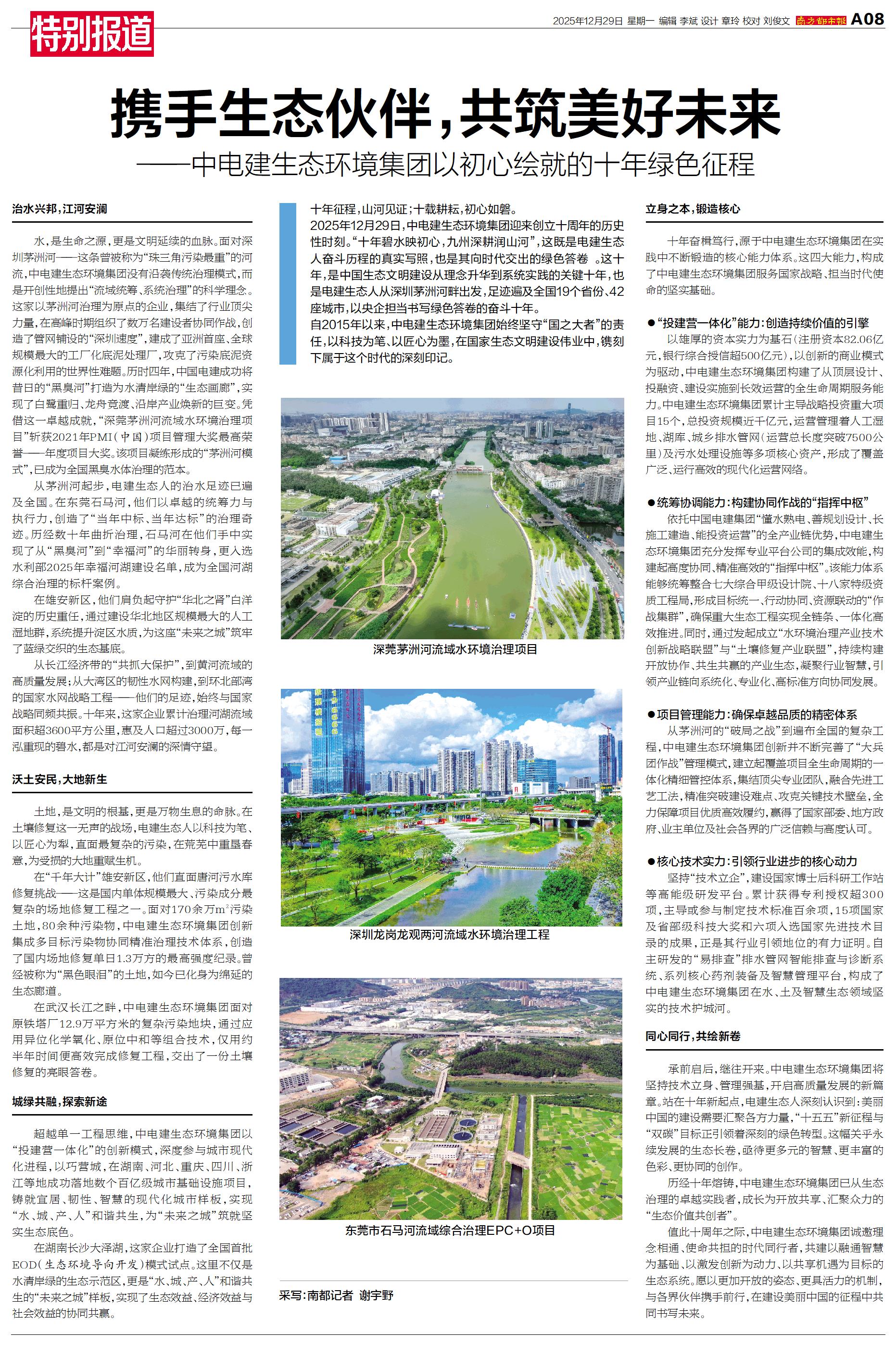 2025年12月29日,中电建生态环境集团迎来创立十周年的历史性时刻。“十年碧水映初心,九州深耕润山河”,这既是电建生态人奋斗历程的真实写照,也是其向时代交出的绿色答卷 。这十年,是中国生态文明建设从理念升华到系统实践的关键十年,也是电建生态人从深圳茅洲河畔出发,足迹遍及全国19个省份、42座城市,以央企担当书写绿色答卷的奋斗十年。