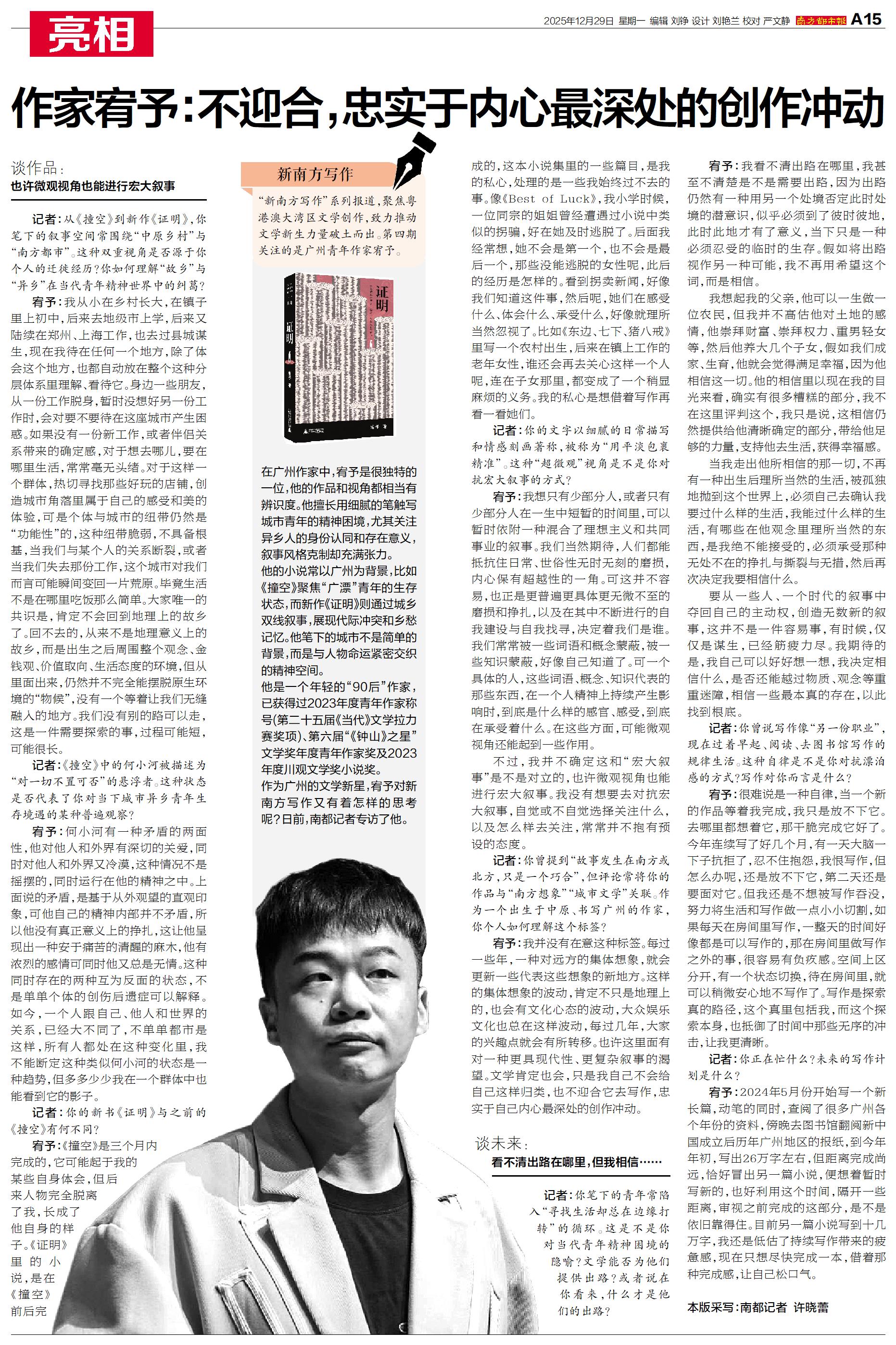“新南方写作”系列报道,聚焦粤港澳大湾区文学创作,致力推动文学新生力量破土而出。第四期关注的是广州青年作家宥予。