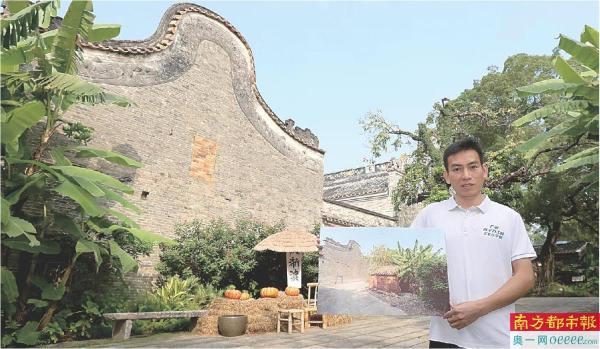 塱头村支书黄智云手捧着三年前自己拍摄改造前旧场景照片留影。