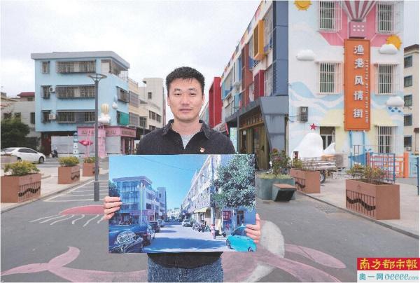 云澳镇副镇长梁东在渔港风情街前手捧旧照片留影。