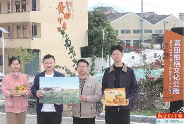 黄田镇干部与村民手捧沙糖桔和镇风貌提升前旧照片合影。