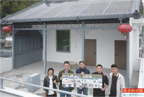 淡地组城樟社区工作者手捧改造前照片在光伏坡屋顶下留影。