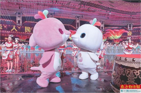 吉祥物“乐融融”和“喜洋洋”在十五运会的水舞台边上表演“亲亲”。