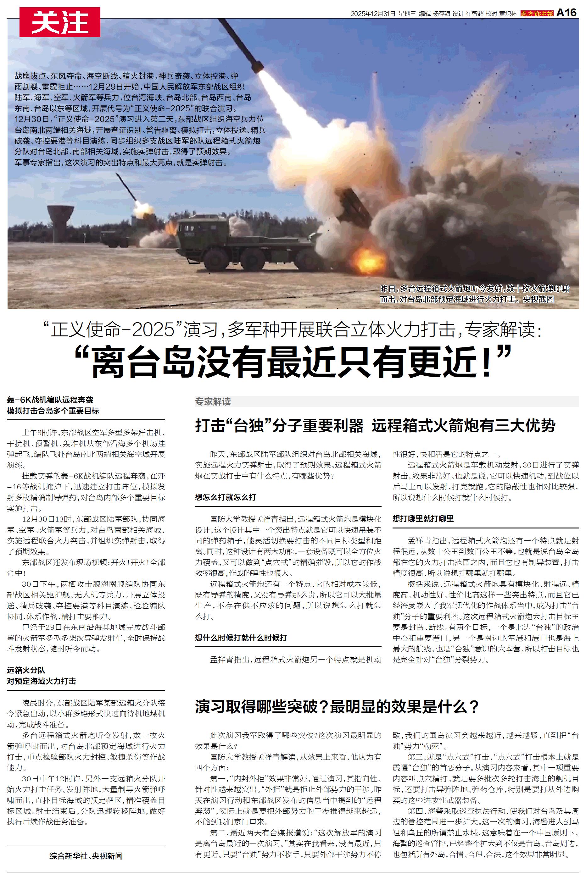 12月29日开始,中国人民解放军东部战区组织陆军、海军、空军、火箭军等兵力,位台湾海峡、台岛北部、台岛西南、台岛东南、台岛以东等区域,开展代号为“正义使命-2025”的联合演习。