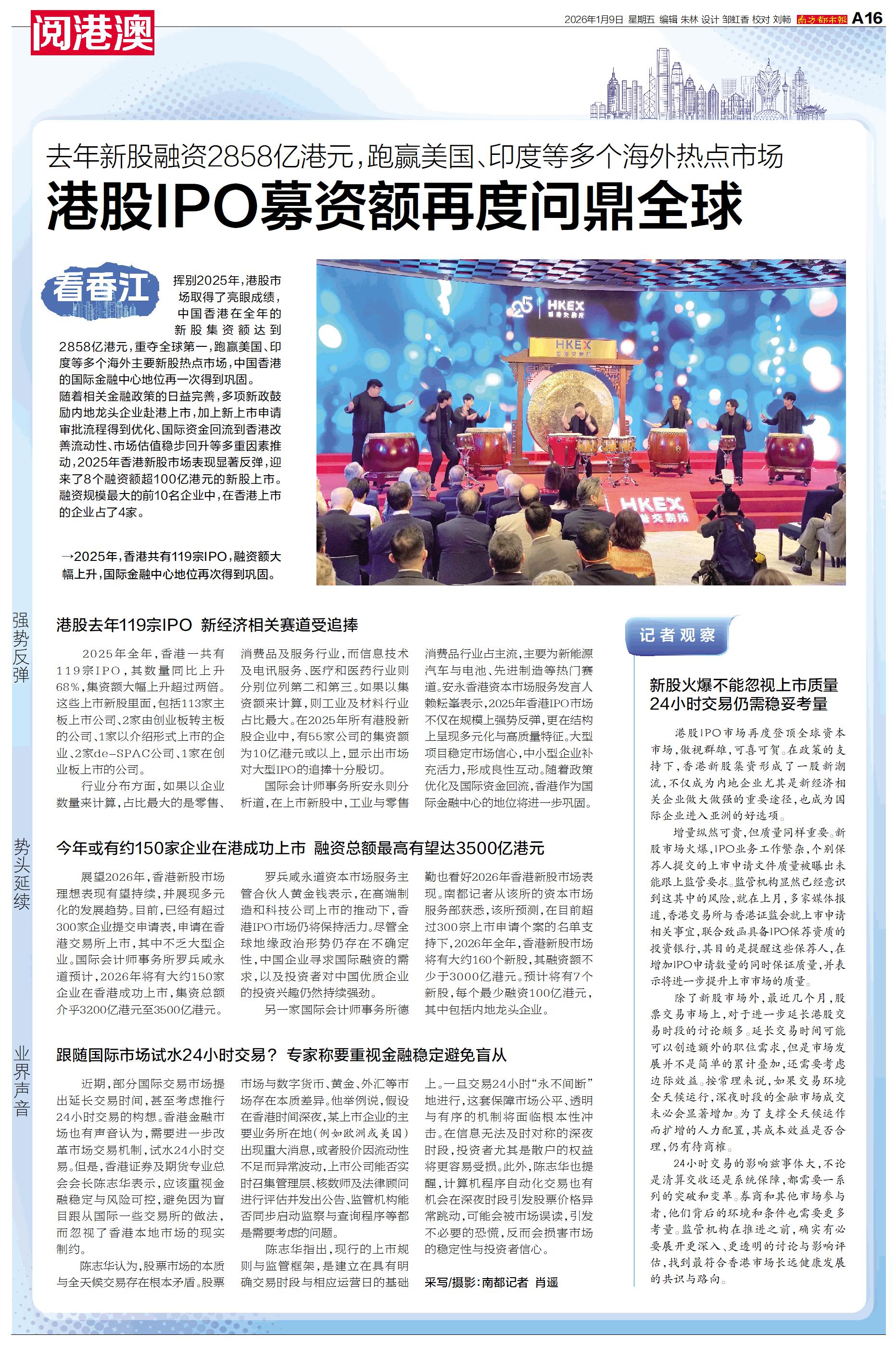 挥别2025年,港股市场取得了亮眼成绩,中国香港在全年的新股集资额达到2858亿港元,重夺全球第一,跑赢美国、印度等多个海外主要新股热点市场,中国香港的国际金融中心地位再一次得到巩固。
