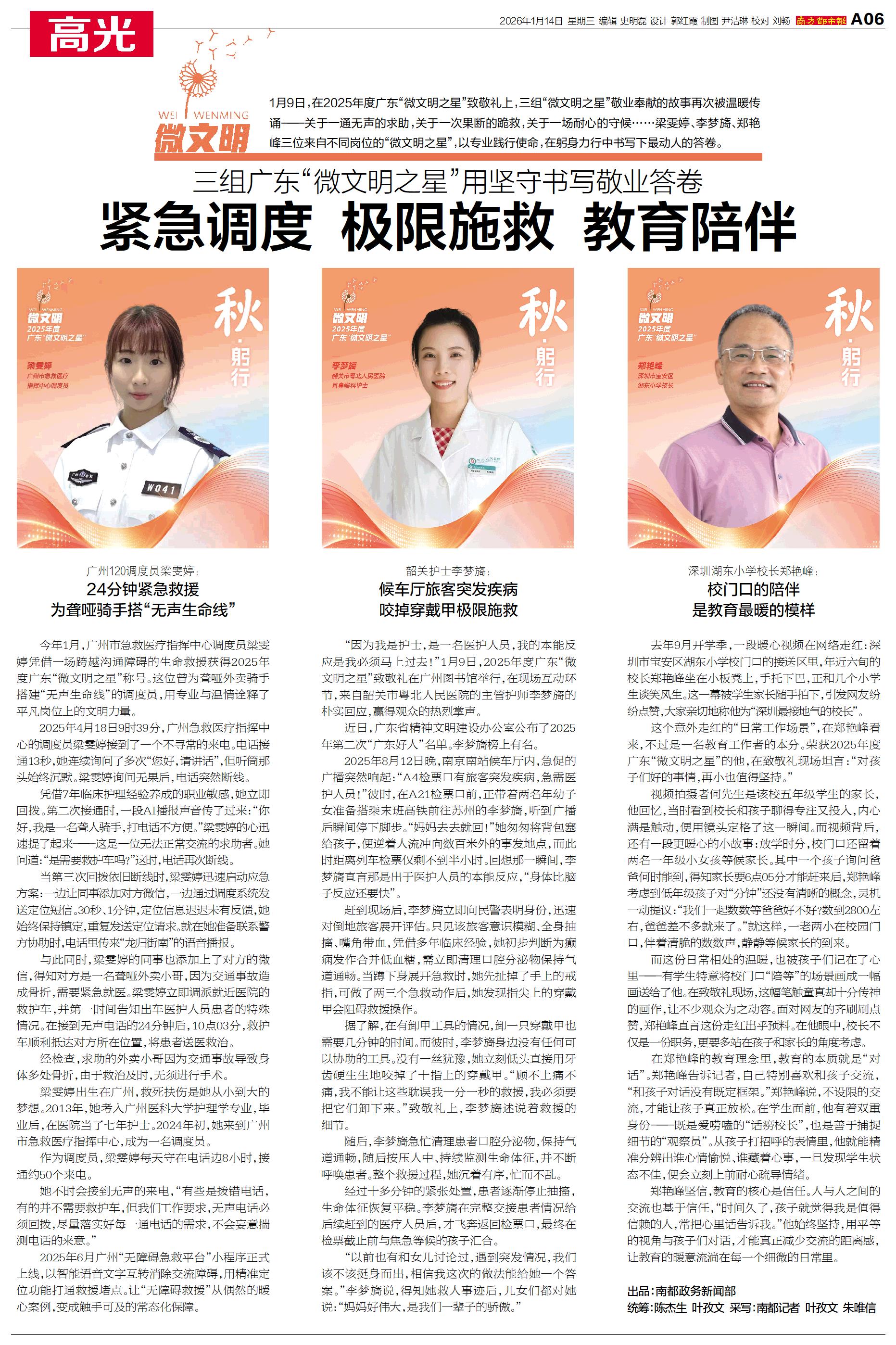 1月9日,在2025年度广东“微文明之星”致敬礼上,三组“微文明之星”敬业奉献的故事再次被温暖传诵——关于一通无声的求助,关于一次果断的跪救,关于一场耐心的守候