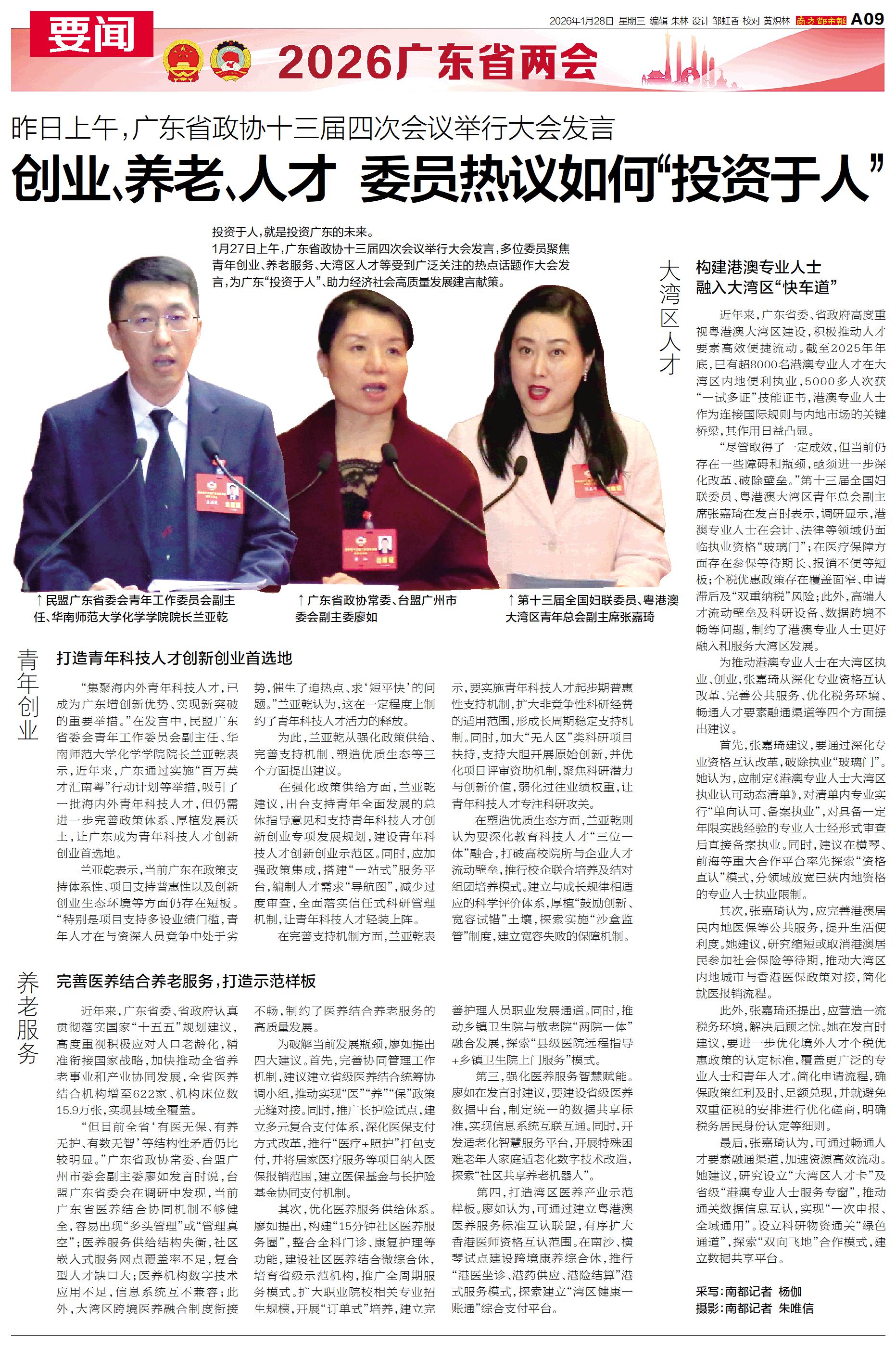 1月27日上午,广东省政协十三届四次会议举行大会发言,多位委员聚焦青年创业、养老服务、大湾区人才等受到广泛关注的热点话题作大会发言,为广东“投资于人”、助力经济社会高质量发展建言献策。