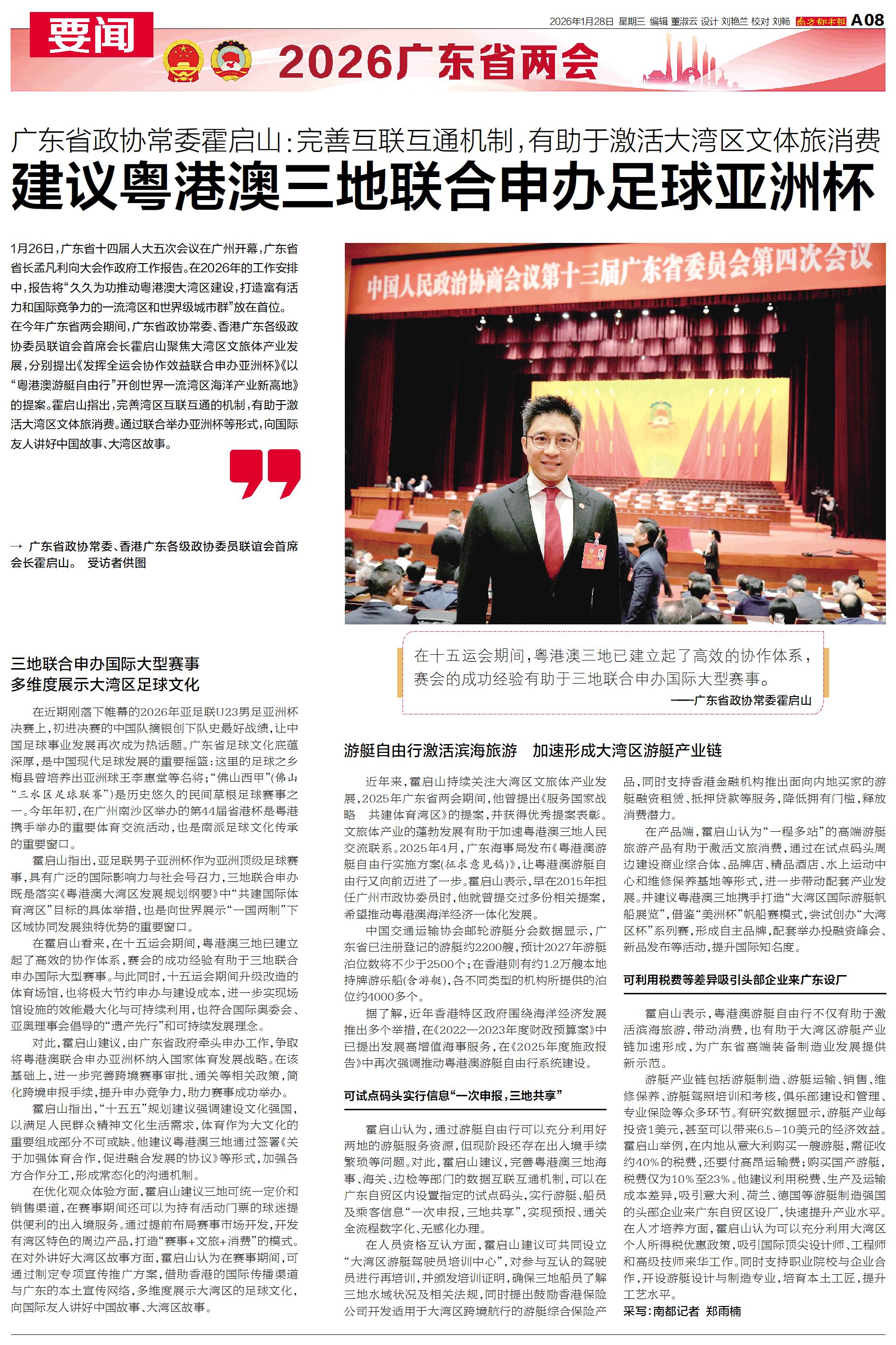广东省政协常委、香港广东各级政协委员联谊会首席会长霍启山聚焦大湾区文旅体产业发展,分别提出《发挥全运会协作效益联合申办亚洲杯》《以“粤港澳游艇自由行”开创世界一流湾区海洋产业新高地》的提案。