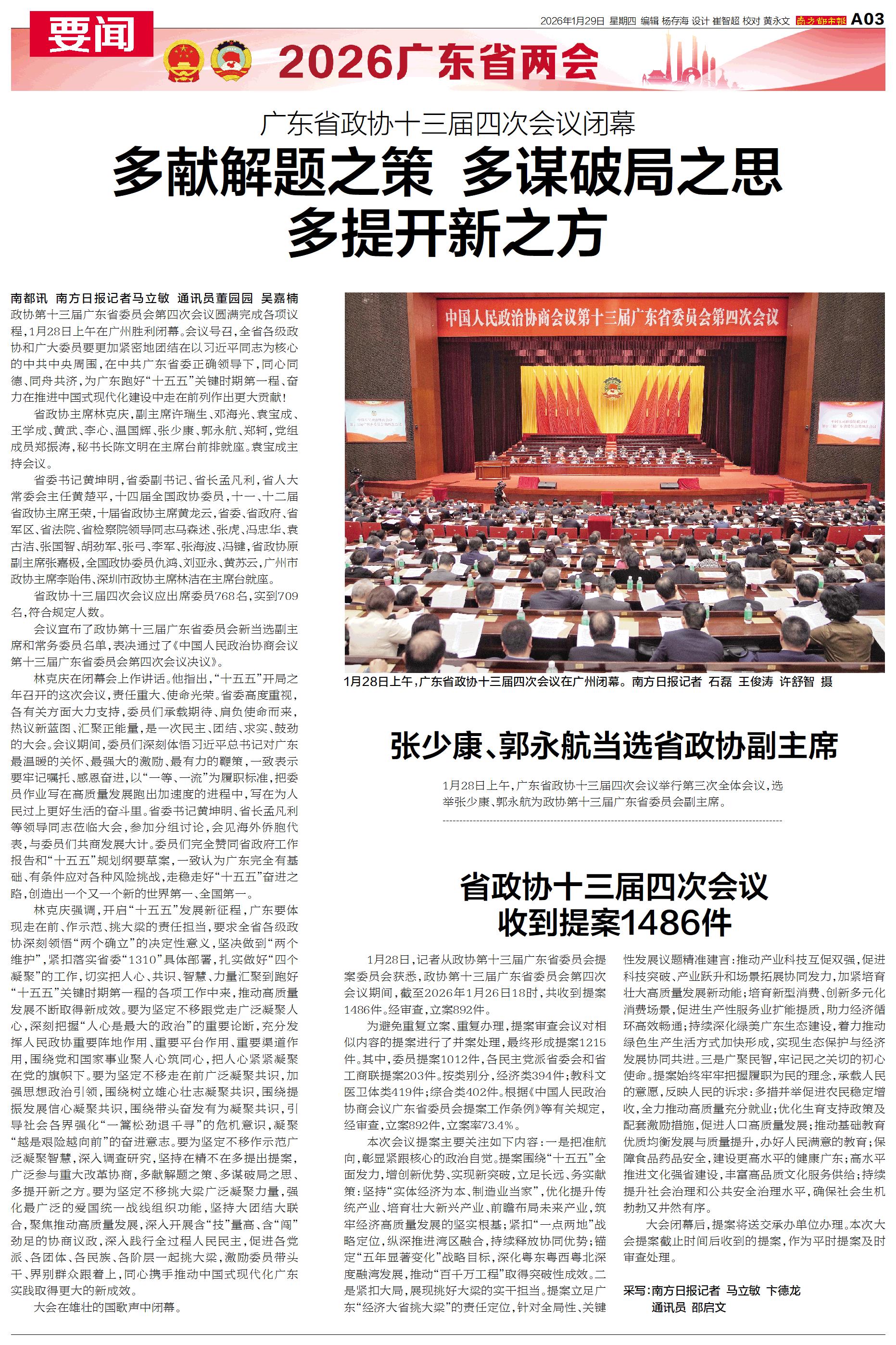 1月28日上午,广东省政协十三届四次会议举行第三次全体会议,选举张少康、郭永航为政协第十三届广东省委员会副主席。