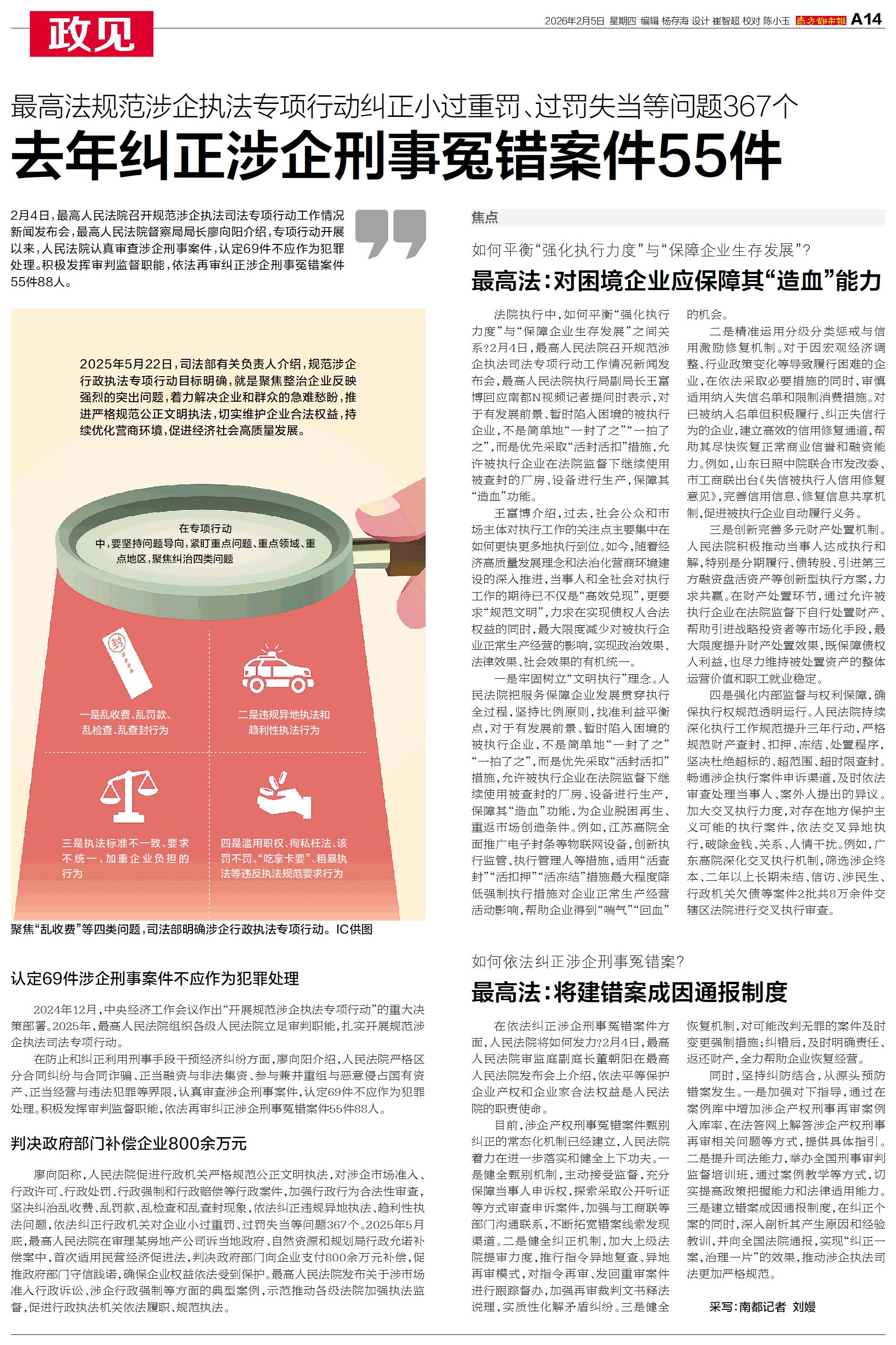 2月4日,最高人民法院召开规范涉企执法司法专项行动工作情况新闻发布会,最高人民法院督察局局长廖向阳介绍,专项行动开展以来,人民法院认真审查涉企刑事案件,认定69件不应作为犯罪处理。