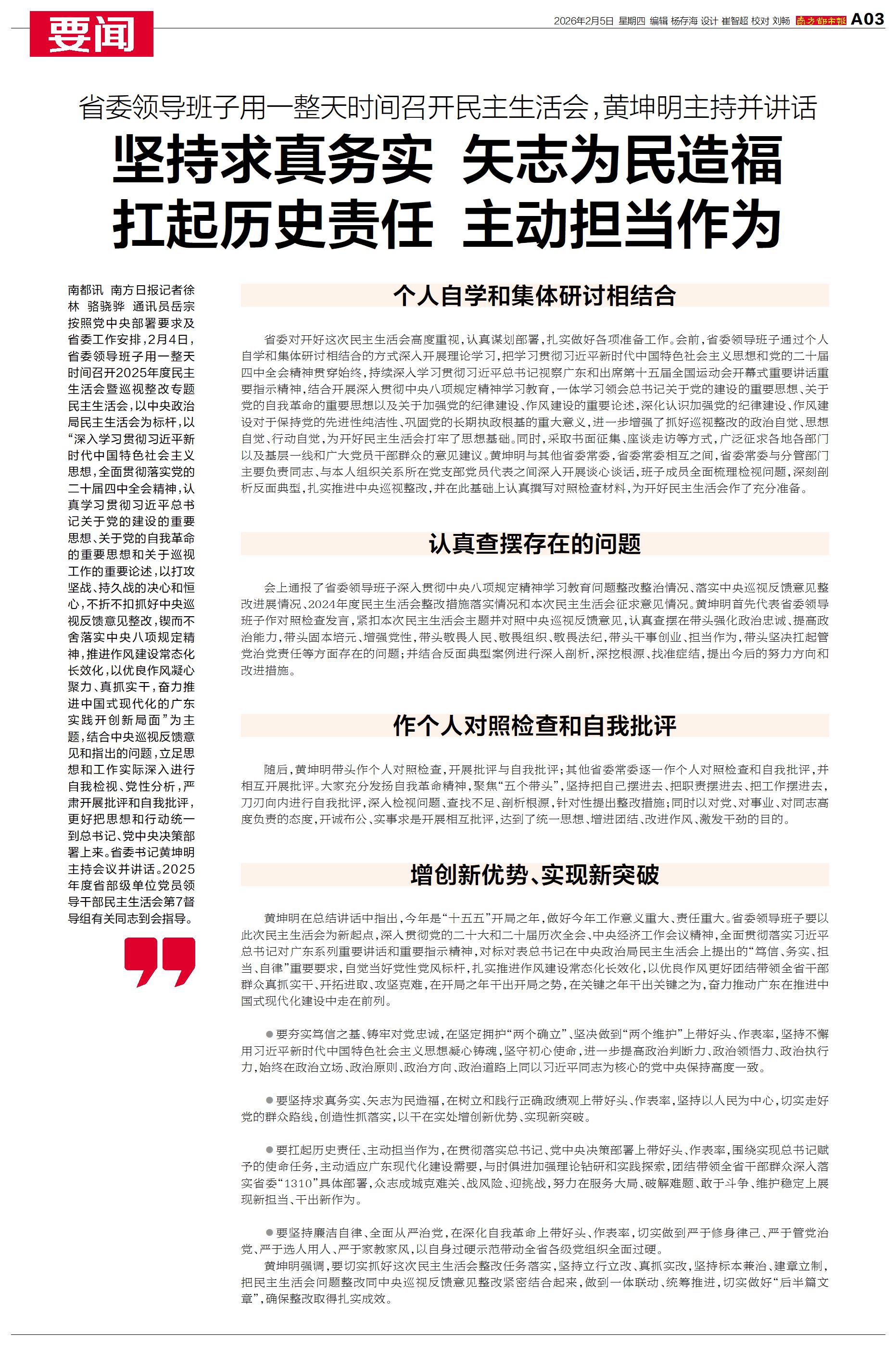 按照党中央部署要求及省委工作安排,2月4日,省委领导班子用一整天时间召开2025年度民主生活会暨巡视整改专题民主生活会。