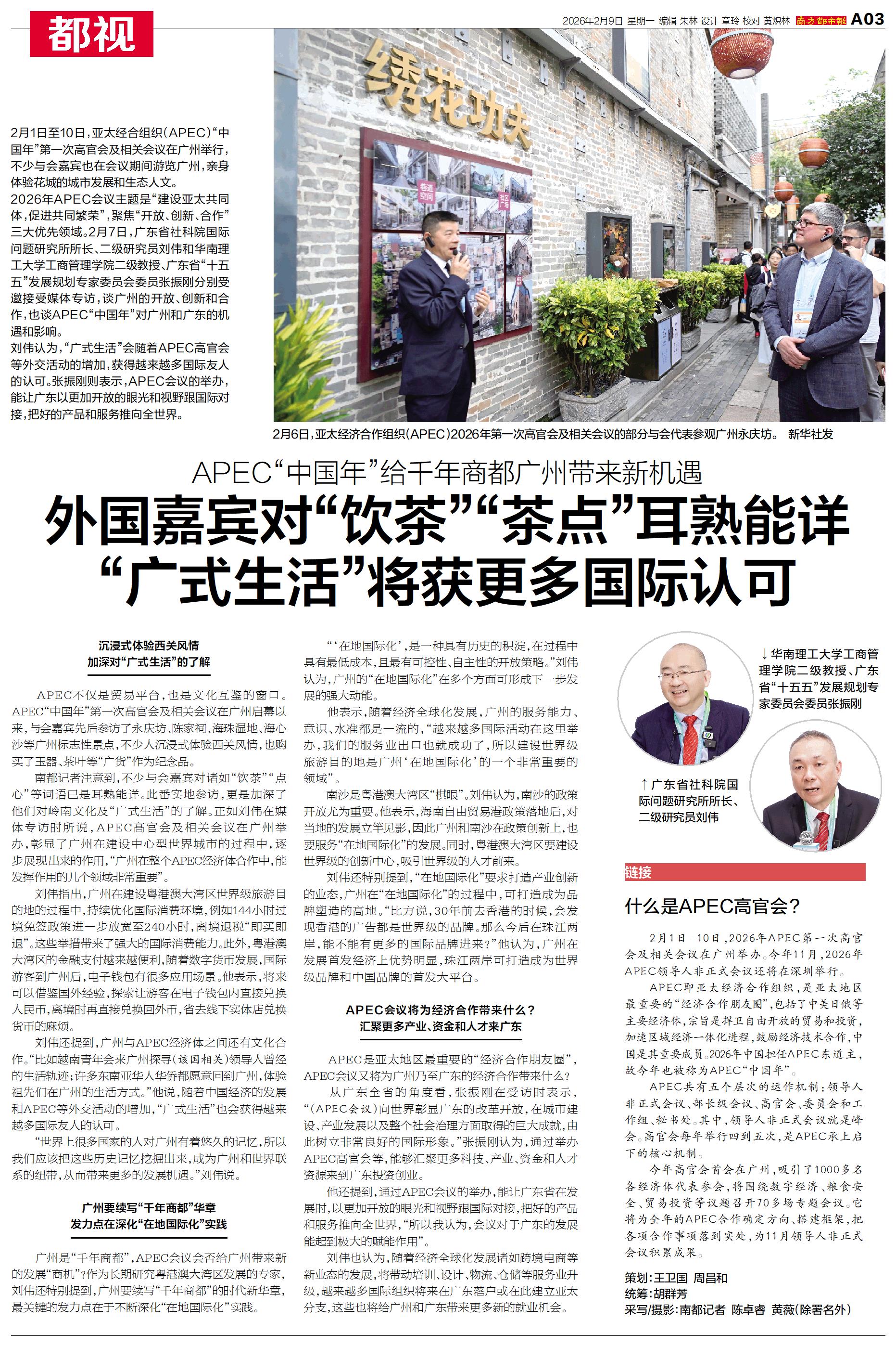 2月1日至10日,亚太经合组织(APEC)“中国年”第一次高官会及相关会议在广州举行,不少与会嘉宾也在会议期间游览广州,亲身体验花城的城市发展和生态人文。