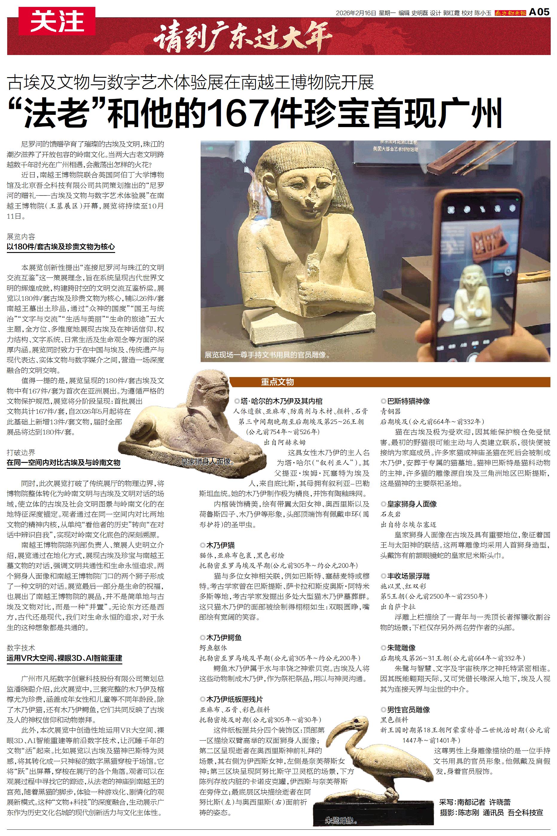 近日,南越王博物院联合英国阿伯丁大学博物馆及北京吾仝科技有限公司共同策划推出的“尼罗河的赠礼——古埃及文物与数字艺术体验展”在南越王博物院(王墓展区)开幕,展览将持续至10月11日。