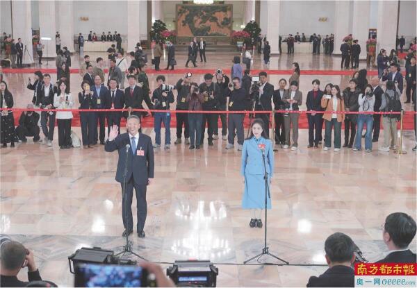 3月9日,第十四届全国人民代表大会第四次会议第二场“代表通道”集中采访活动在人民大会堂举行。全国人大代表李长东(左)接受媒体采访。 新华社发