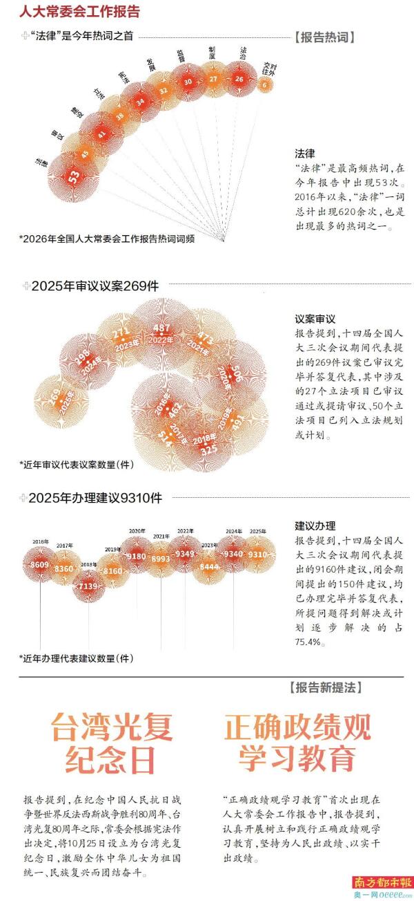 南都大数据研究院注意到,报告中出现“台湾光复纪念日”“正确政绩观学习教育”等多个新提法,体现人大常委会过去一年取得的新进展和成效,也透露今后一年工作的新看点。