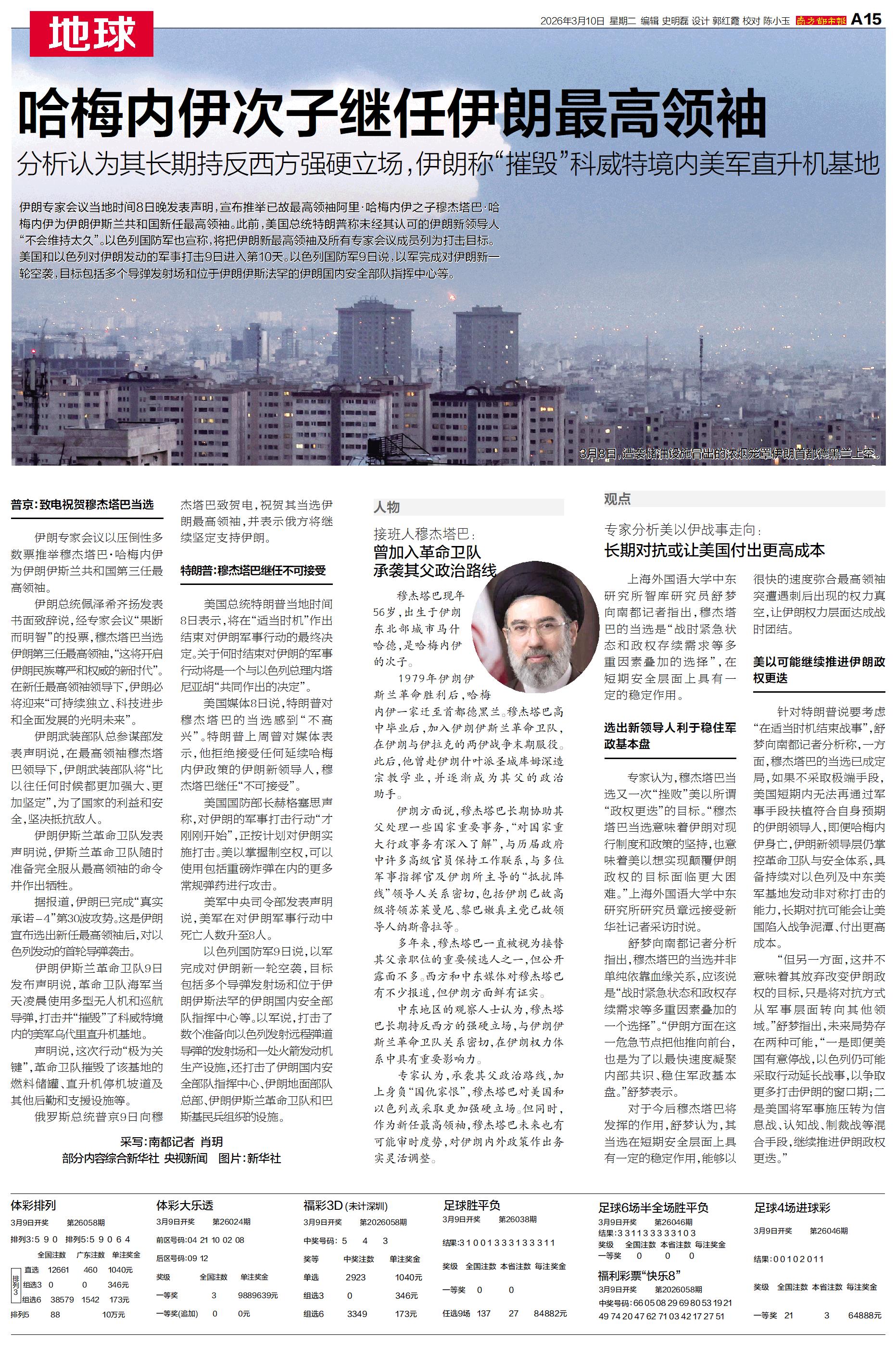 伊朗专家会议当地时间8日晚发表声明,宣布推举已故最高领袖阿里·哈梅内伊之子穆杰塔巴·哈梅内伊为伊朗伊斯兰共和国新任最高领袖。