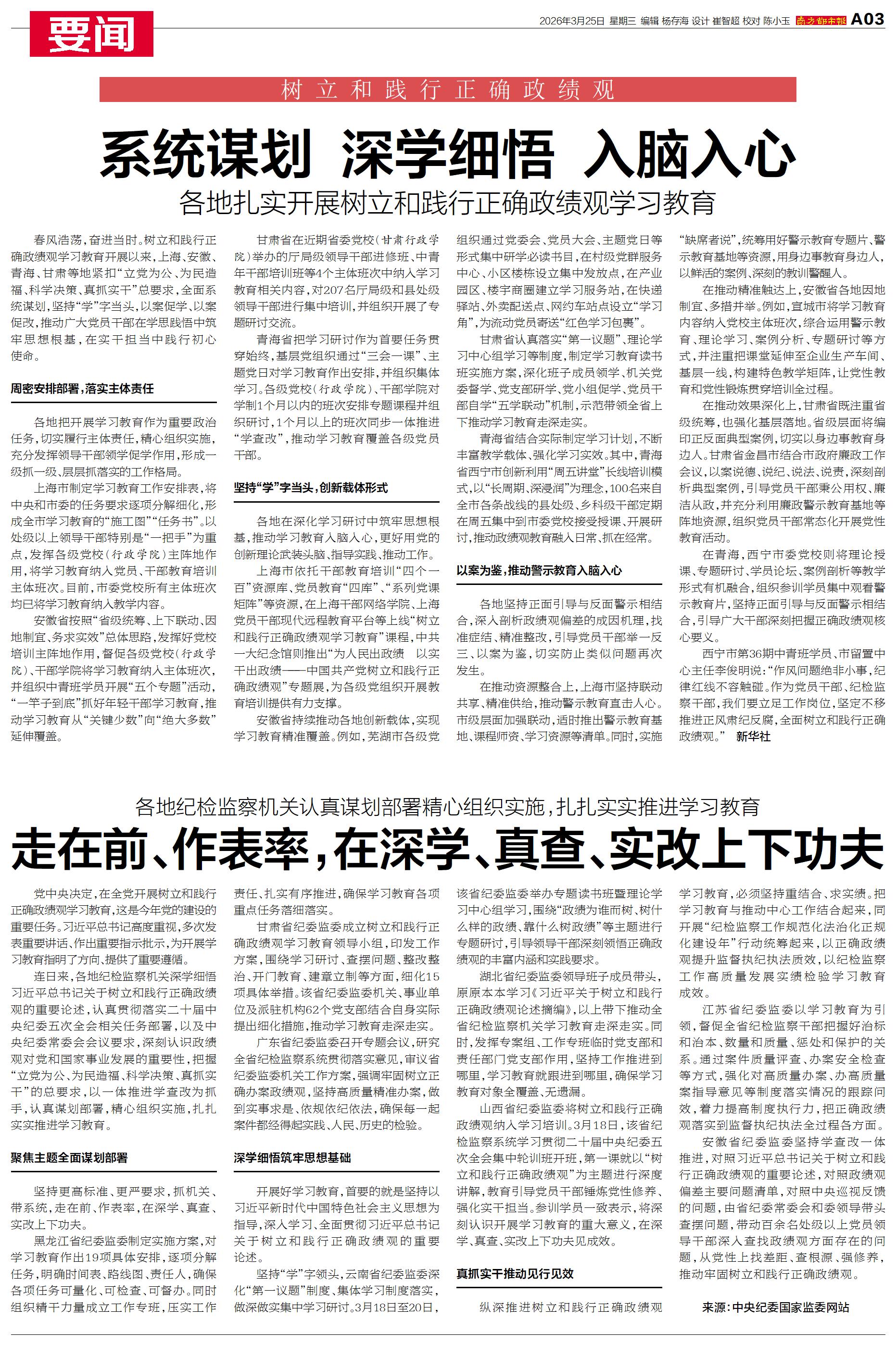 树立和践行正确政绩观学习教育开展以来,上海、安徽、青海、甘肃等地紧扣“立党为公、为民造福、科学决策、真抓实干”总要求,全面系统谋划,坚持“学”字当头,以案促学、以案促改,推动广大党员干部在学思践悟中筑