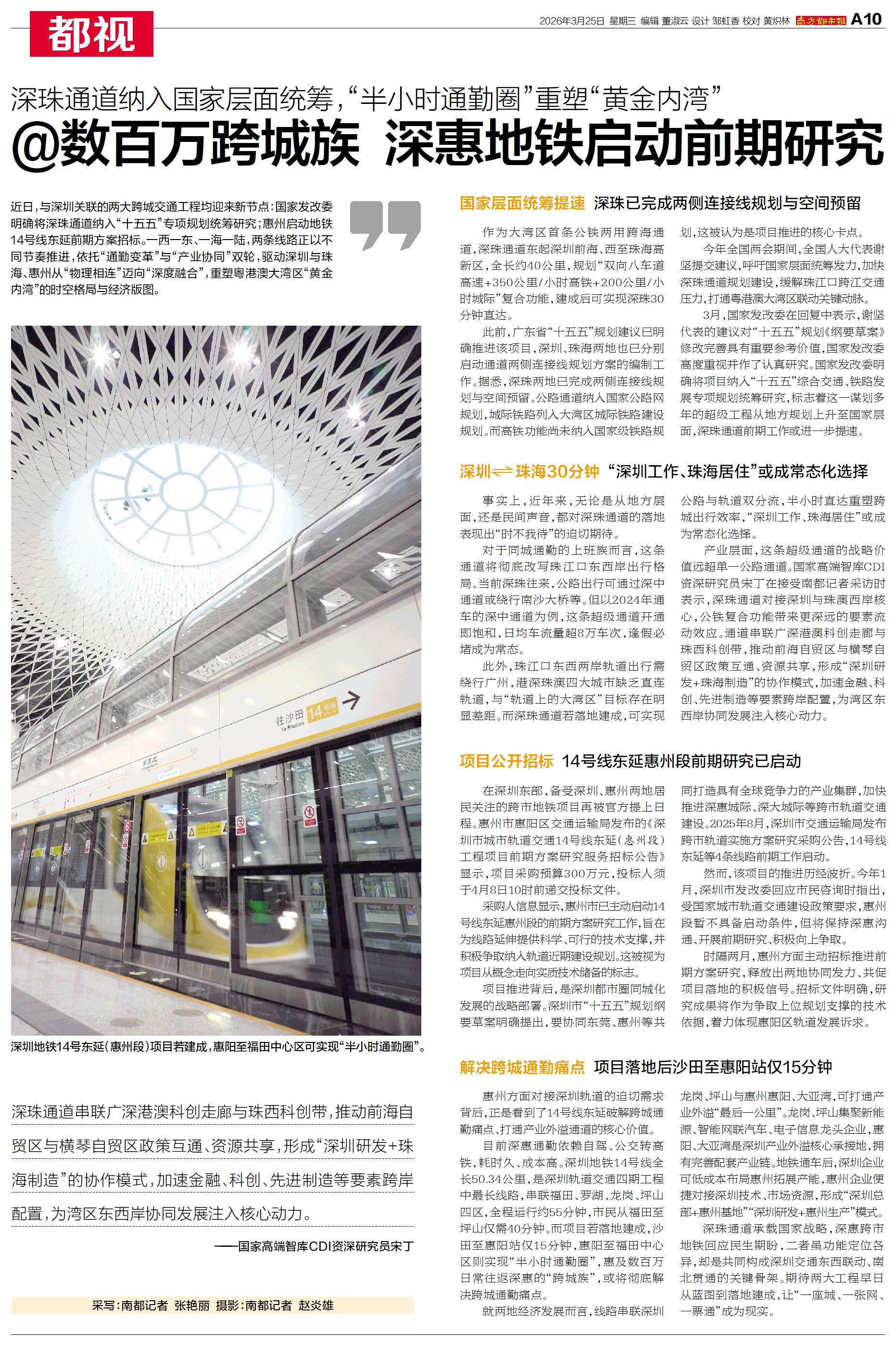 近日,与深圳关联的两大跨城交通工程均迎来新节点:国家发改委明确将深珠通道纳入“十五五”专项规划统筹研究;惠州启动地铁14号线东延前期方案招标。