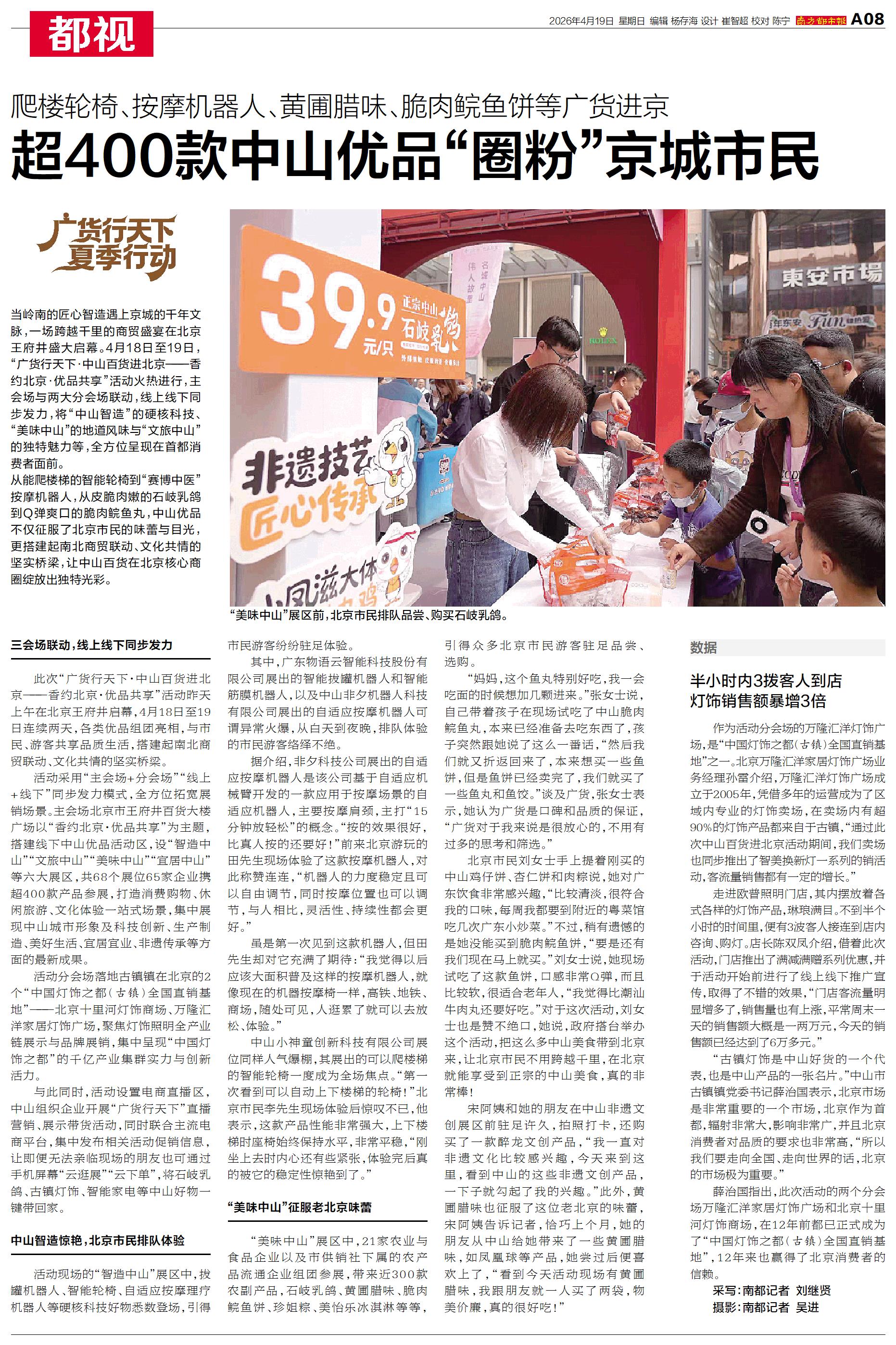 从能爬楼梯的智能轮椅到“赛博中医”按摩机器人,从皮脆肉嫩的石岐乳鸽到Q弹爽口的脆肉鲩鱼丸,中山优品不仅征服了北京市民的味蕾与目光,更搭建起南北商贸联动、文化共情的坚实桥梁,让中山百货在北京核心商圈绽放出独特光彩。