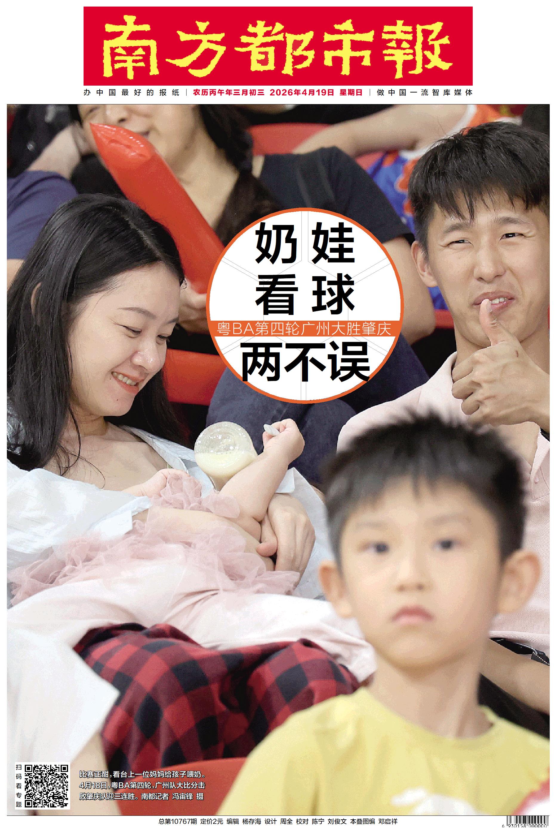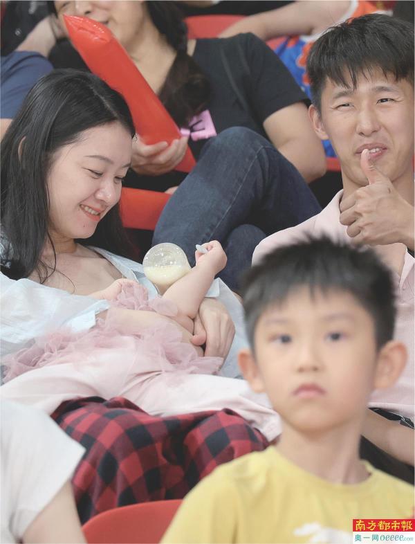 比赛正酣,看台上一位妈妈给孩子喂奶。4月18日,粤BA第四轮,广州队大比分击败肇庆队迎三连胜。 南都记者 冯宙锋 摄