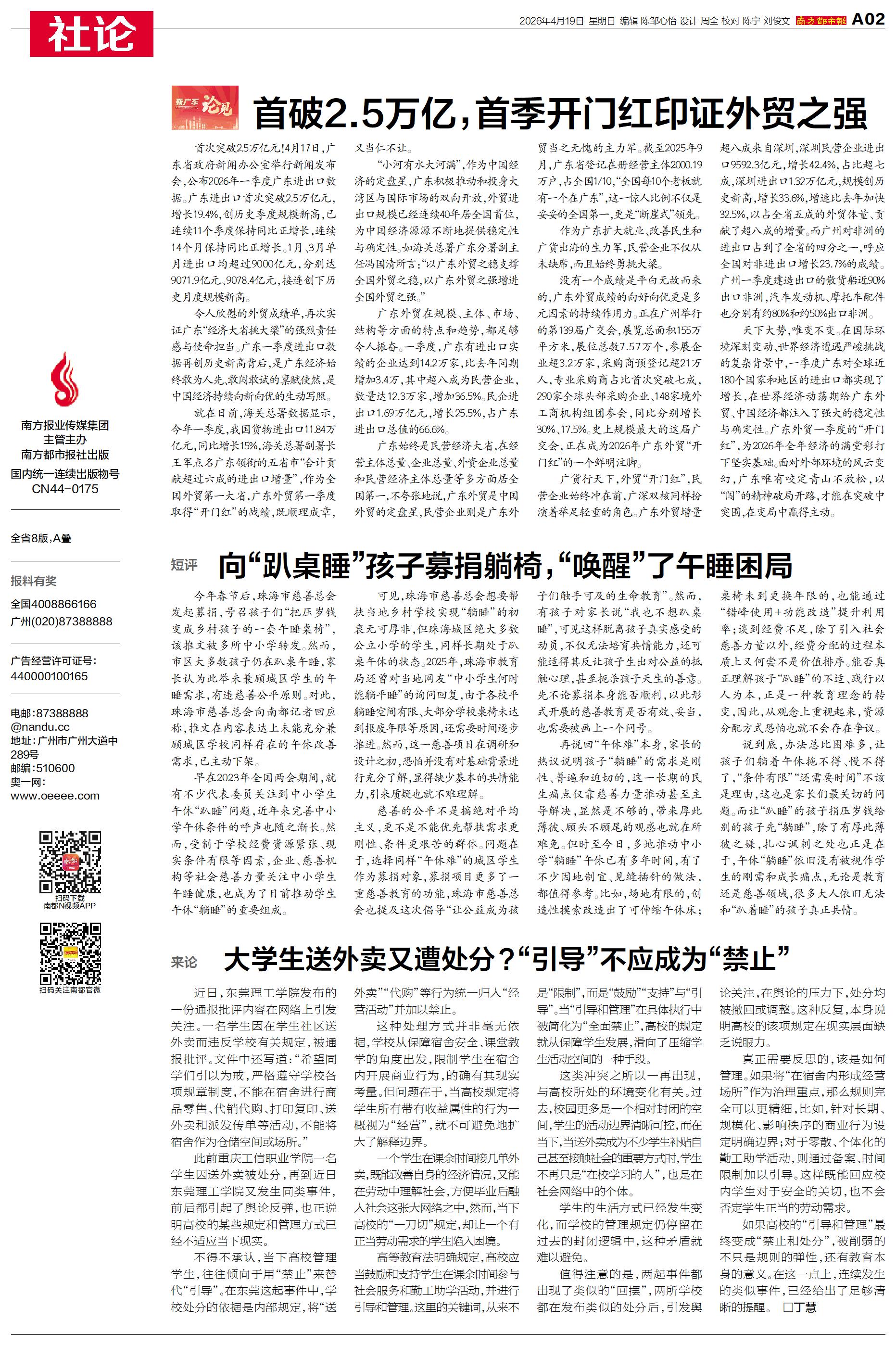 令人欣慰的外贸成绩单,再次实证广东“经济大省挑大梁”的强烈责任感与使命担当。广东一季度进出口数据再创历史新高背后,是广东经济始终敢为人先、敢闯敢试的禀赋使然,是中国经济持续向新向优的生动写照。