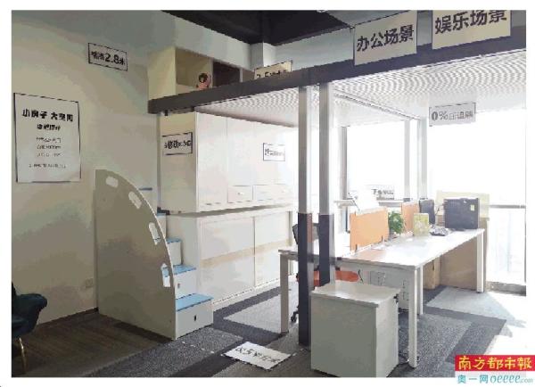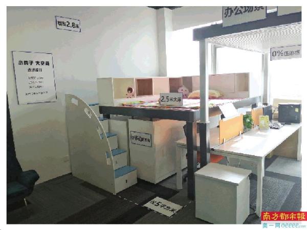 现场,陈智诚向南都记者展示了二代产品的使用,一个复式公寓的架构,下层空间要更大一些,顶层是一块平板和床边柜,一侧的楼梯,可以实现上下走动,底层则是一个落地大衣柜,另一侧则是一张办公桌,中间留有走道。