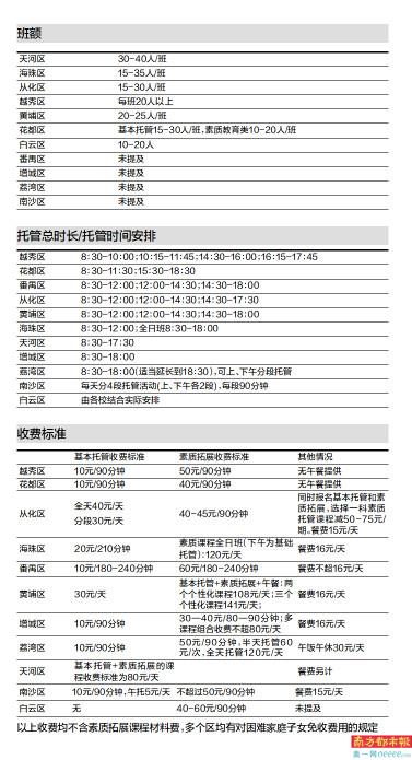 就托管模式方面看,虽然各区都安排了基本托管和素质拓展的托管服务,但设计略有不同。如越秀区就可提供服务的4个时间段,自愿申请参加其中1个或多个时间段,至于该时段想参加哪种托管也可根据课表自由搭配;天河区就将“基本托管”“素质拓展”“午休午饭”三项服务打包为“一日优选课程”;海珠区则分上午基本托管班和素质课程全日班;从化区有4所学校开设全天托管服务,两所学校提供分段托管服务,而分段托管则可自行选择参加基本托管或素质拓展。