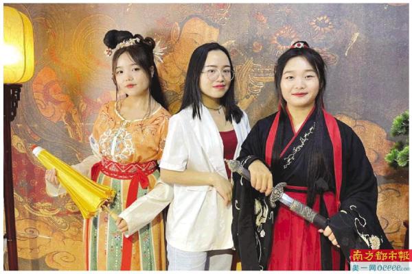 汉服造型师小石(中间)与换装后的小徐(左)和小尚(右)。 南都研究员 麦洁莹 摄