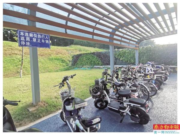 近日,有市民向南都“记者帮“反映”,黄埔区水西路地铁站附近,新修好的风雨连廊被电动车和共享单车侵占变成“停车场”,行人只能绕廊行走,有违风雨连廊的建设初衷,希望记者帮关注。