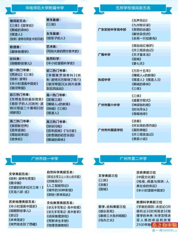在华南师范大学附属中学图书馆,最受欢迎的纸质书前五名分别为《三体》《放学后》《挪威的森林》《摆渡人》和《哈利·波特与阿兹卡班囚徒》,最受男生欢迎的图书为《三体》,最受女生欢迎的书籍则是《偷影子的人》,《趣味物理学》《写给大家的西方美术史》《明朝那些事儿》和《半小时漫画科学史》,分别是数理化类、艺术类、社会科学类和自然科学类最受欢迎的图书。另外,华附图书馆还总结出了不同年级的阅读榜单。
