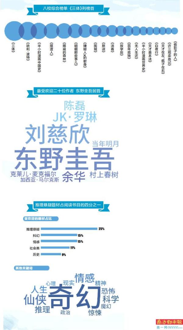 在推理悬疑类读物中,学生们依旧最喜欢东野圭吾的读物。在科幻类读物中,刘慈欣所著的读物以《三体》为代表仍然最为热门。
