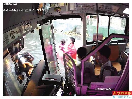 事情发生在6月9日上午7时30分。当时广州市区下起了暴雨。“花果山总站—飞鹅西路”定制公交专线的当班车长颜忠富正载着一群桂花岗小学的学生们上学。当公交车到达目的地桂花岗小学时,由于目的地附近正在修路,下车的位置已被雨水浸过脚踝以上了。