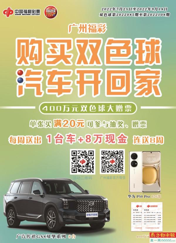近日,广州市福彩中心发布公告称,将自2022年7月25日启动“购买双色球,汽车开回家”大型活动,并首次配套开展400万元双色球大赠票。本次活动将持续开展8周,每周送出1台广汽传祺GS8汽车、15部华为P50 Pro手机。