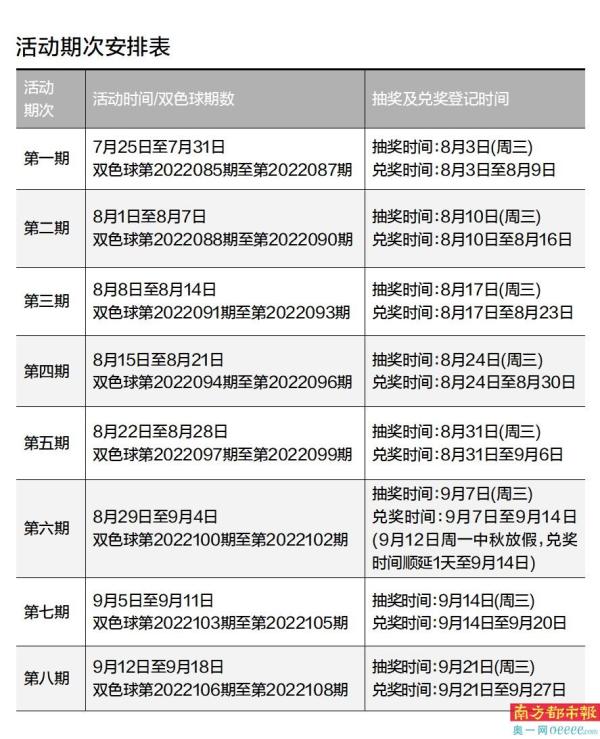 2022年7月25日起,在广州市福彩投注站购买单张双色球彩票满20元以上(含)且中奖(3万元以内且不需缴税)的,在兑奖时可获赠机选8元4注的单式“双色球”彩票一张。活动共安排赠票资金400万元,赠完即止。